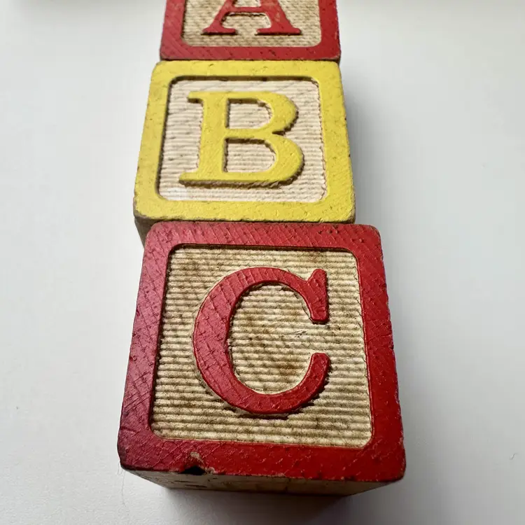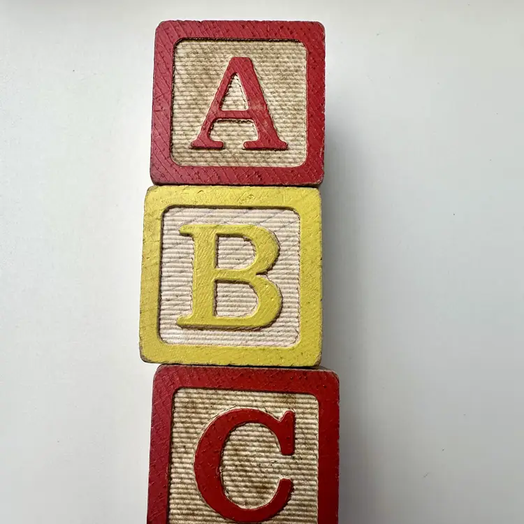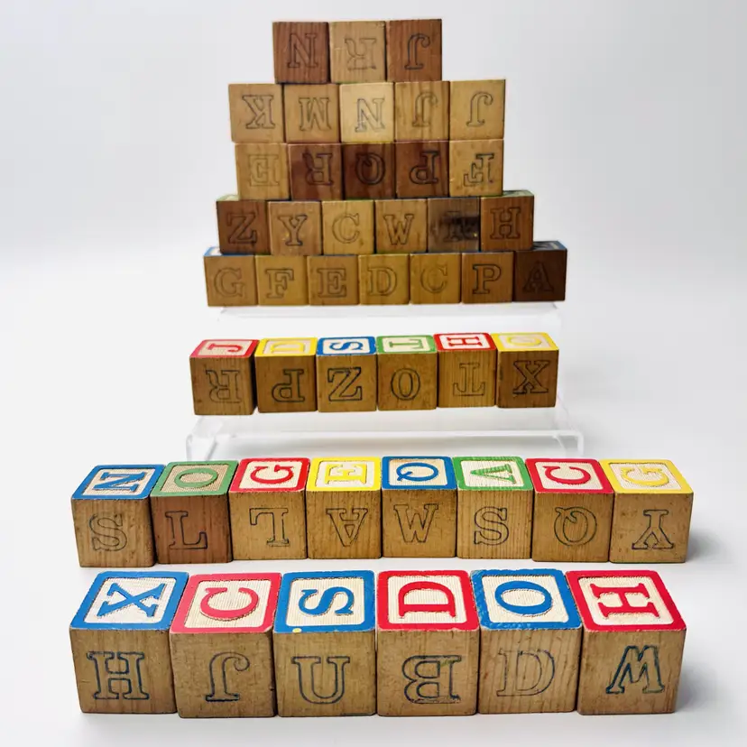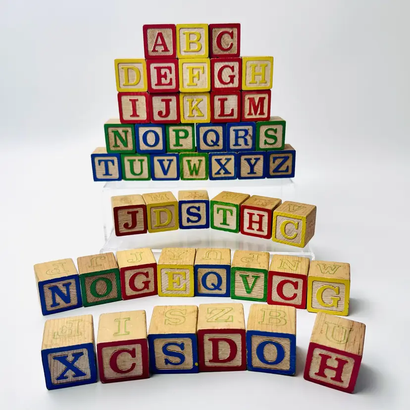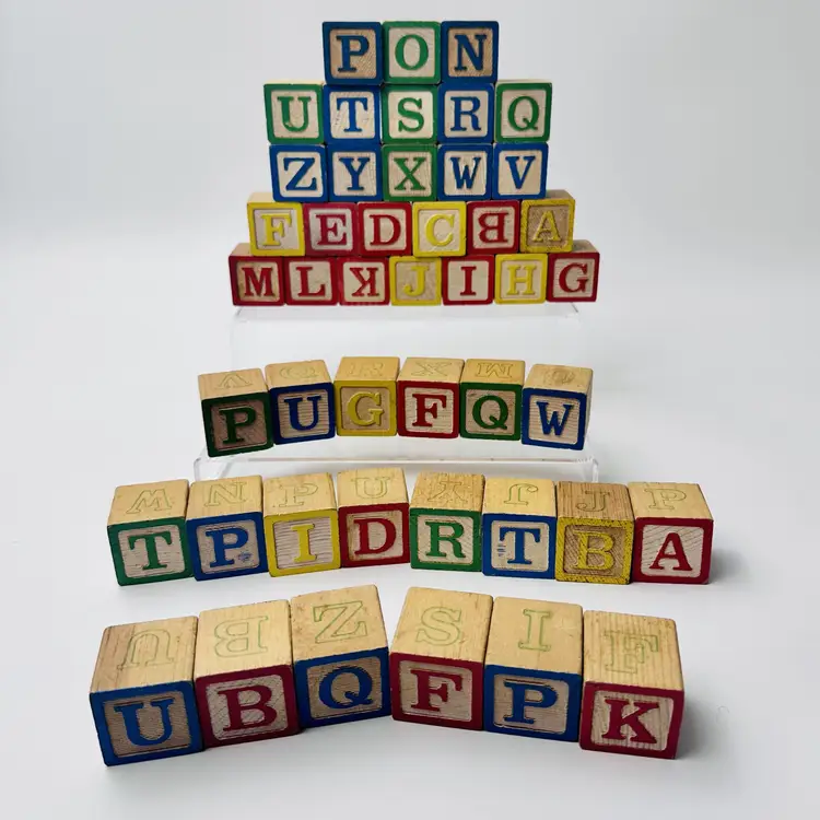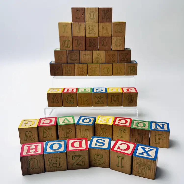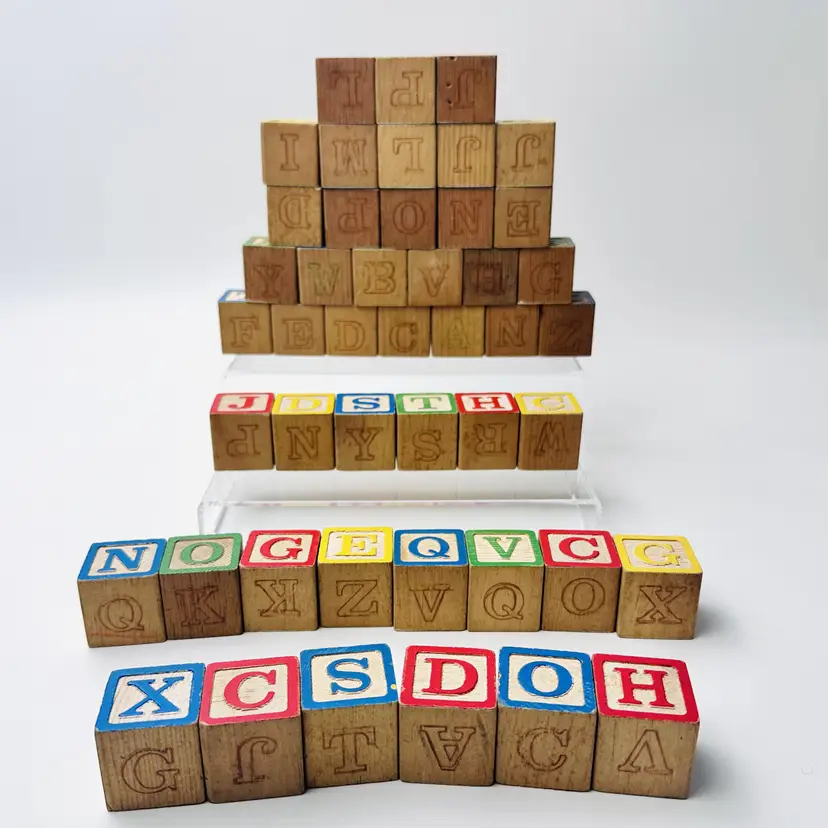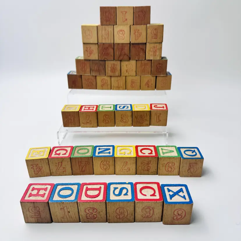 This set is in good vintage condition. Some discoloration to wood due to age. Minor color loss on the painted sides. Printed sides are faded. See all images for details. Each block measures 1 1/4". Altogether they weigh 1lb 7oz