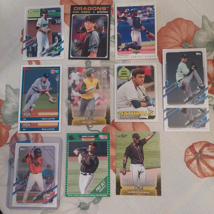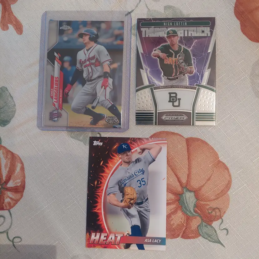 Nick Loftin 2020 Panini Prizm Draft Picks thunderstruck Insert. Shea Langeliers 2020 Topps Pro Debut Chrome. Asa Lacy 2021 Topps Pro Debut heat Insert.