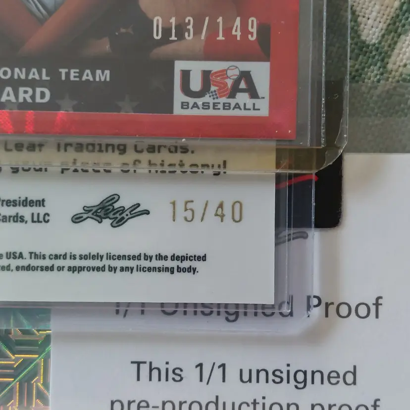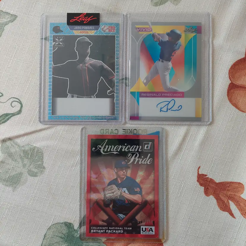 Jairo Pomares 1/1 unsigned proof. Leaf Pro Set. Reginald Preciado auto. #15/40. 2022 Leaf Vivid gray Parallel. Bryant Packard #13/149. 2019 Donruss American Pride Insert. Red Parallel.