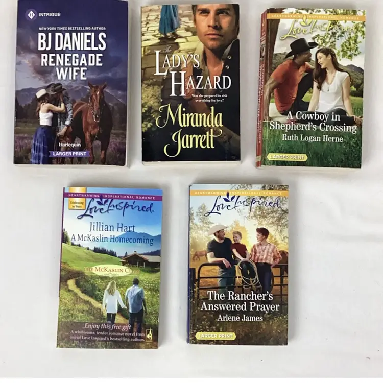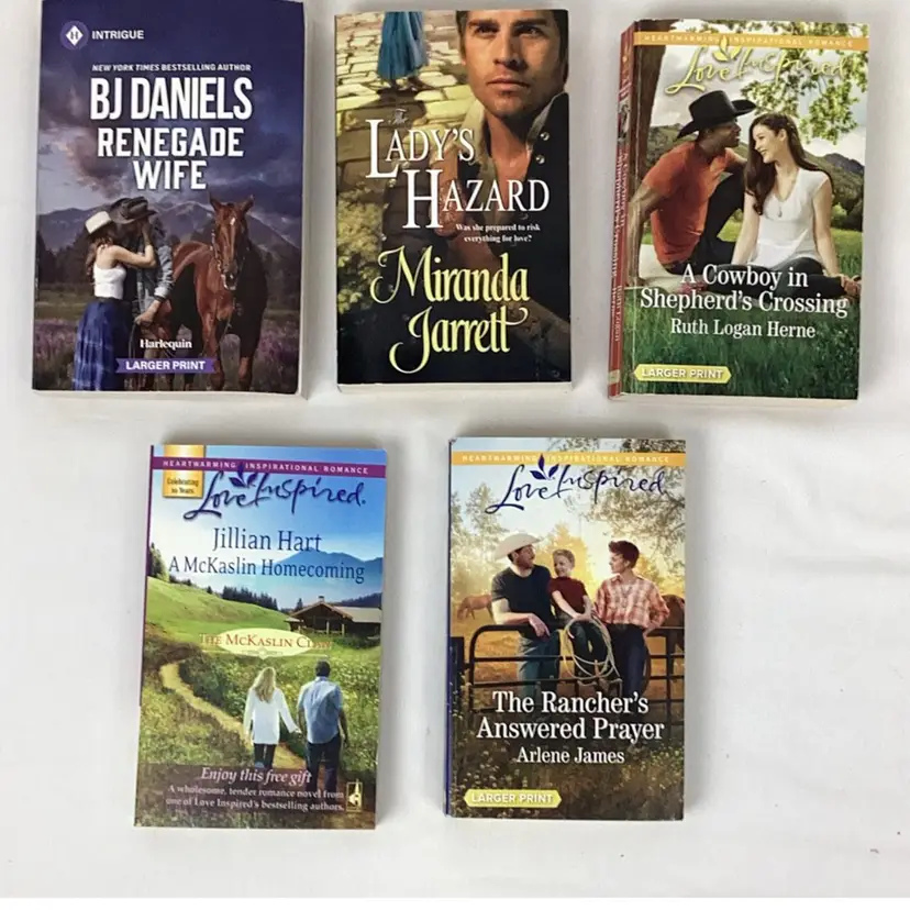 Perfect beach reads. Three are love inspired, one harlequin intrigue , and one Harlequin historical Regency.