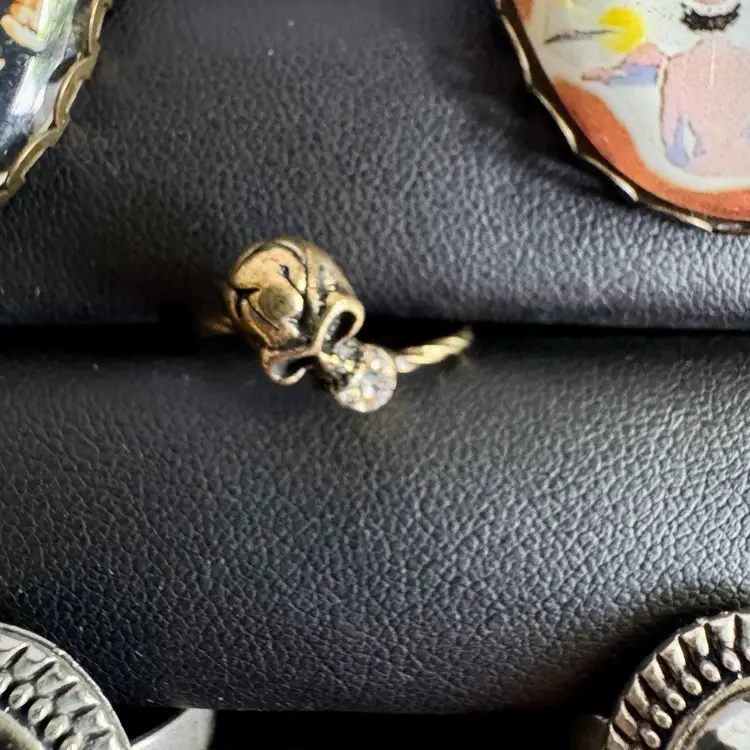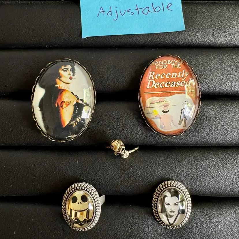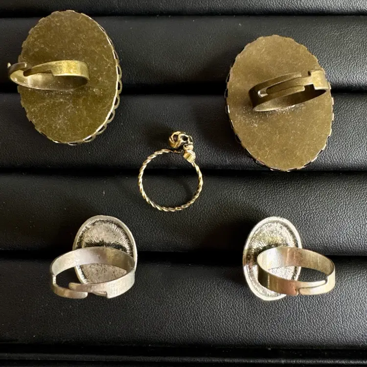 Silver, gold, & brass tones. Combination of metal, glass, plastic, rhinestone. All with minor signs of wear.