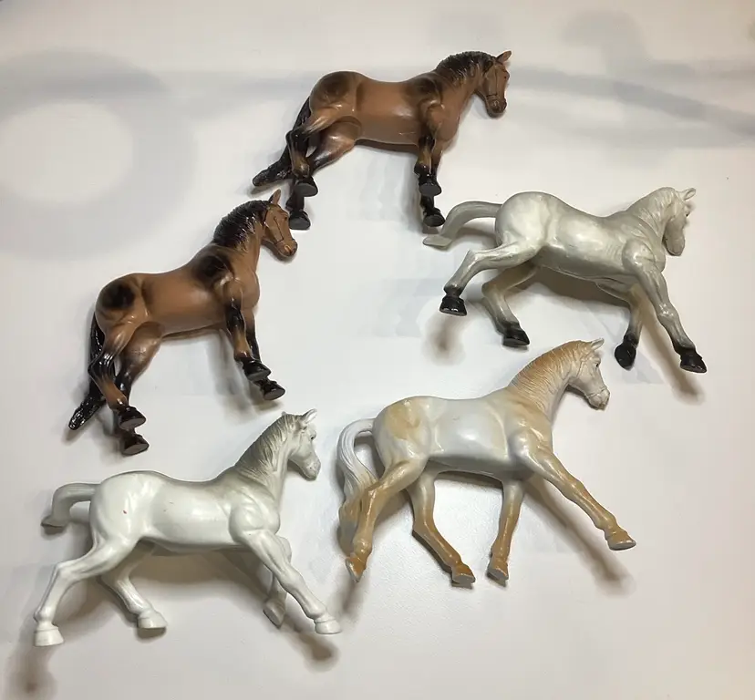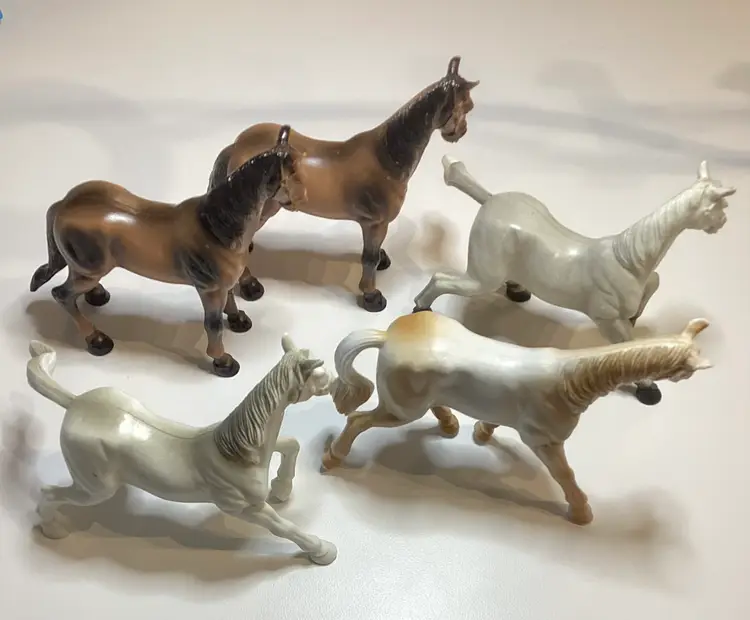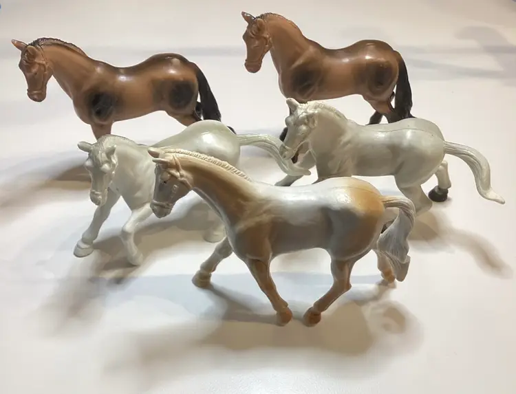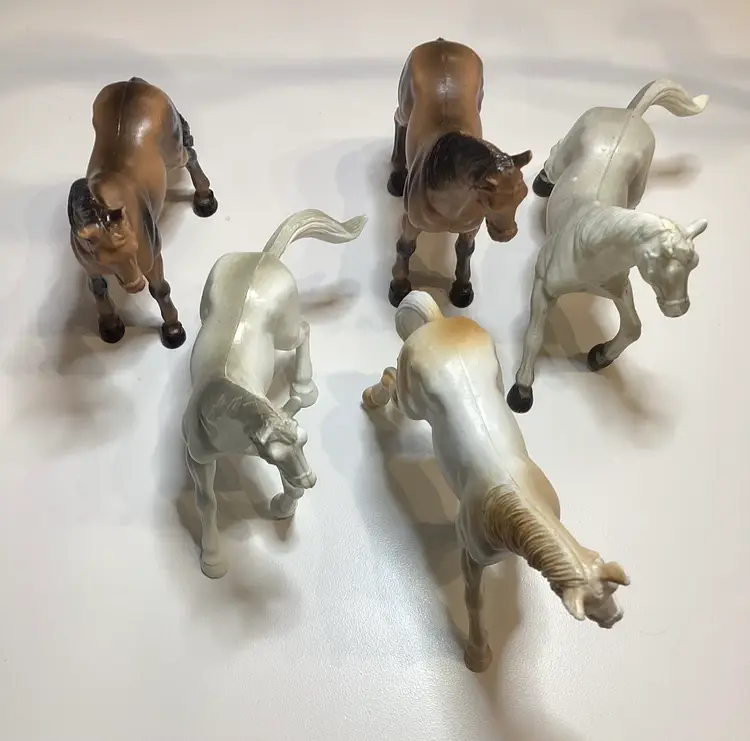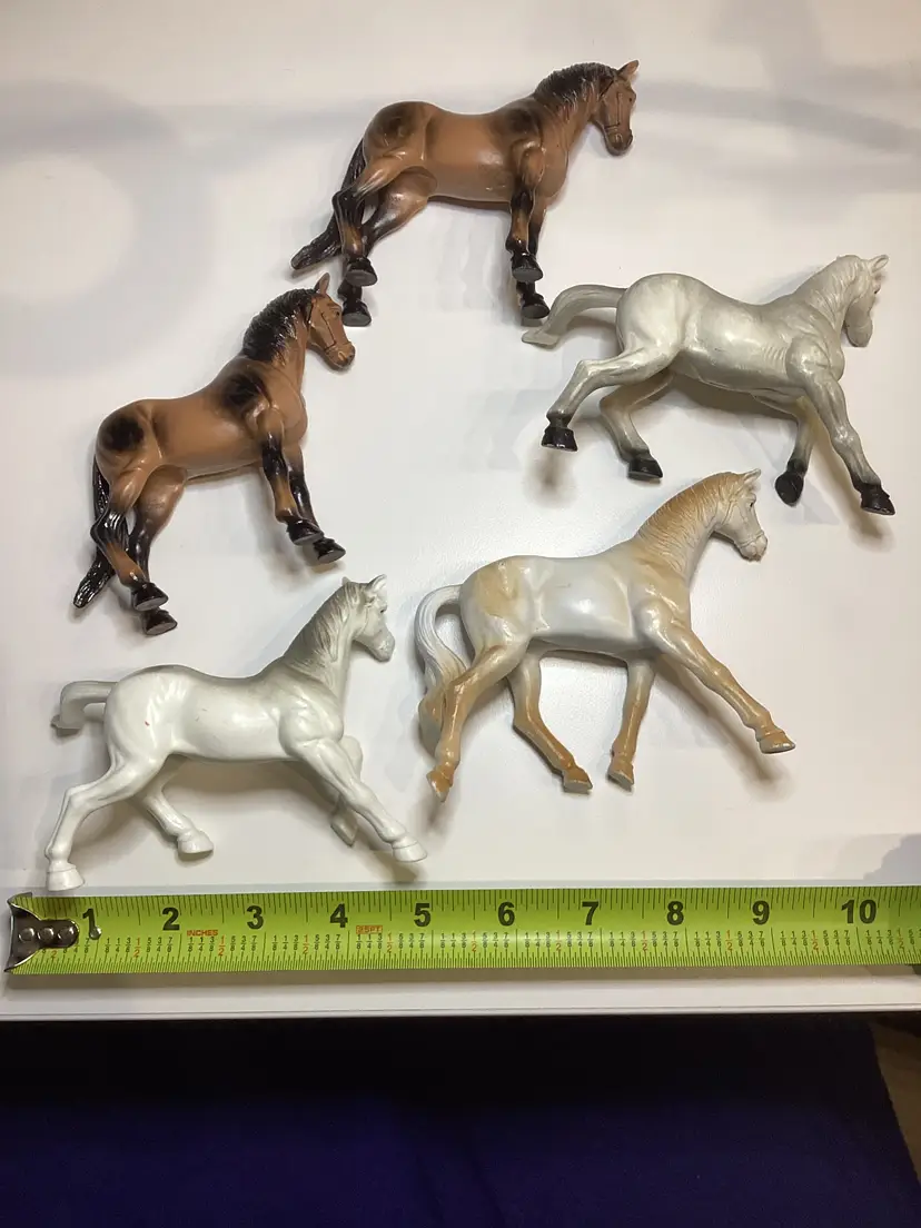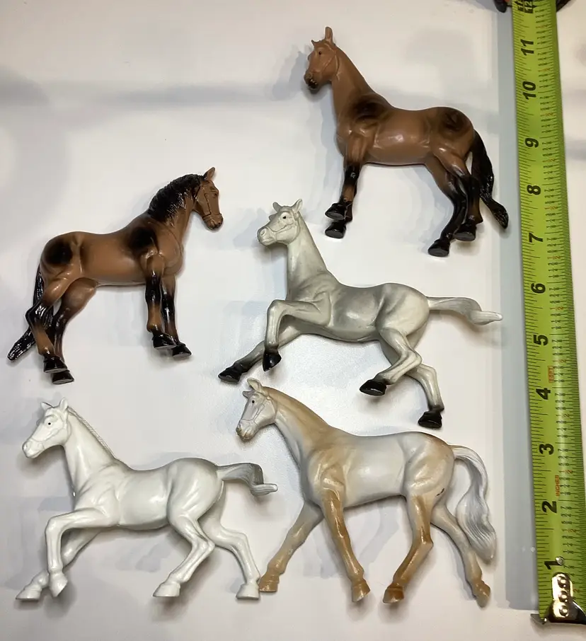 The product is a lot of 5 hollow unbranded plastic horses, each designed in a western equestrian theme. These figurines are perfect for collectors or enthusiasts of model horses, offering a unique and detailed representation of the animal. Made from durable plastic material, these horses are sure to withstand play or display for years to come. With their realistic design and theme, these figurines would make a great addition to any collection or display.