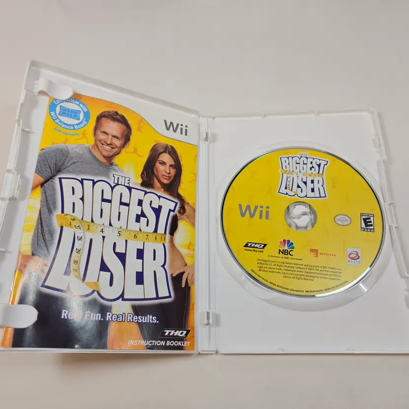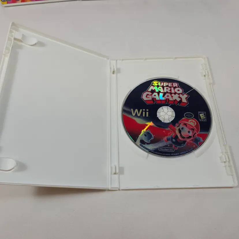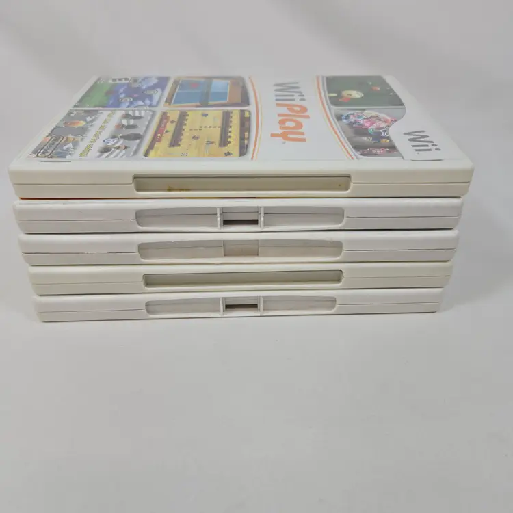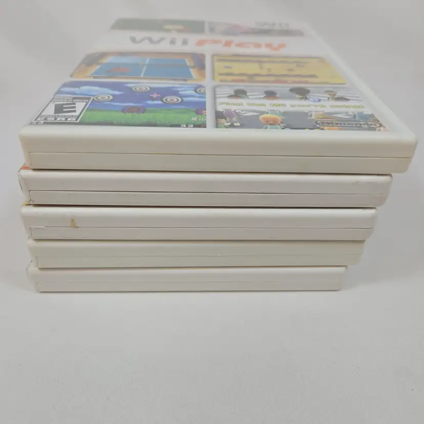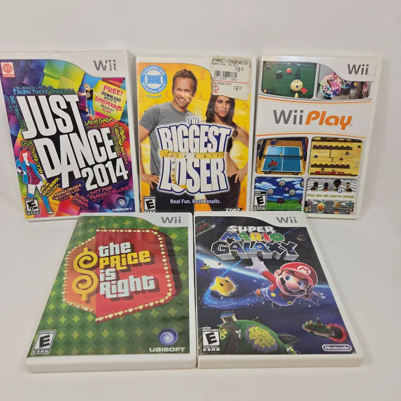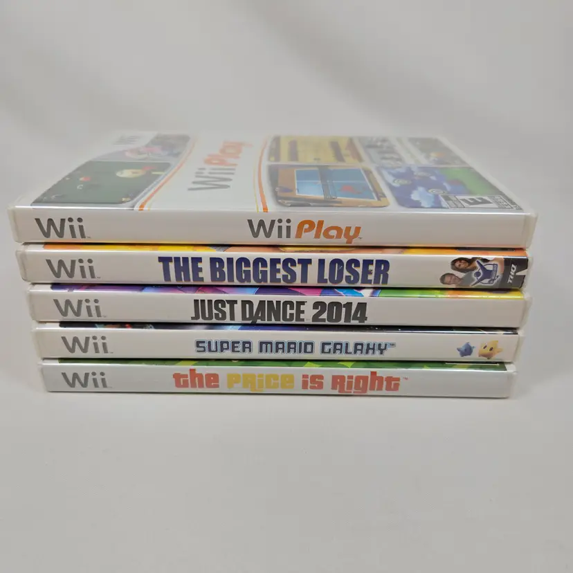 Five pre-owned Nintendo Wii games in original cases: Super Mario Galaxy, Wii Play, Just Dance 2014, The Price Is Right, and The Biggest Loser. Discs show light surface wear from normal play but look clean overall. Untested, sold as-is for a quick gaming score or resale flip.