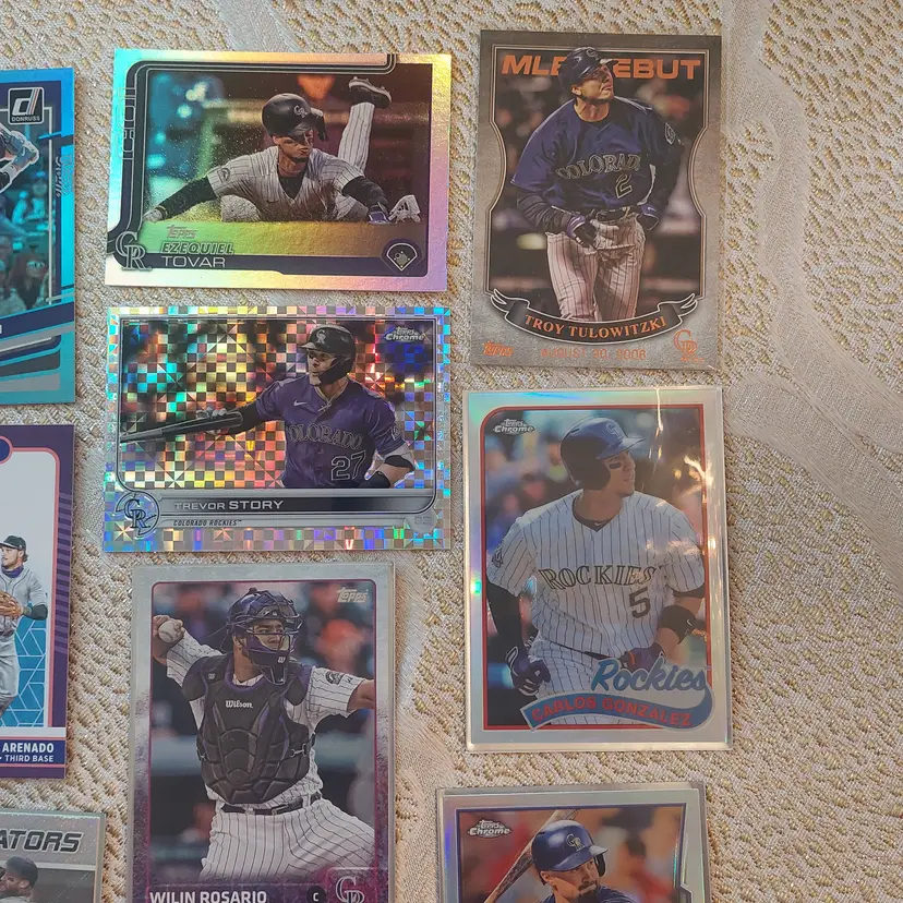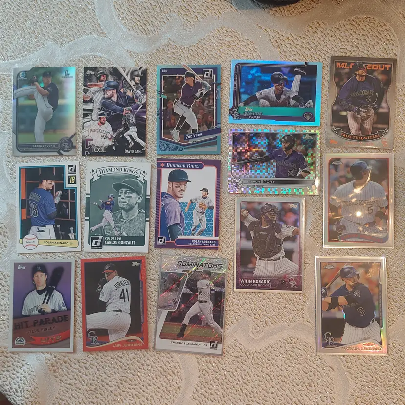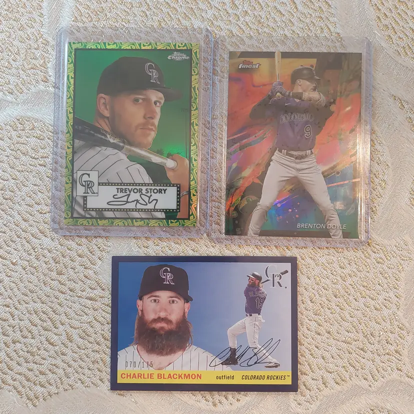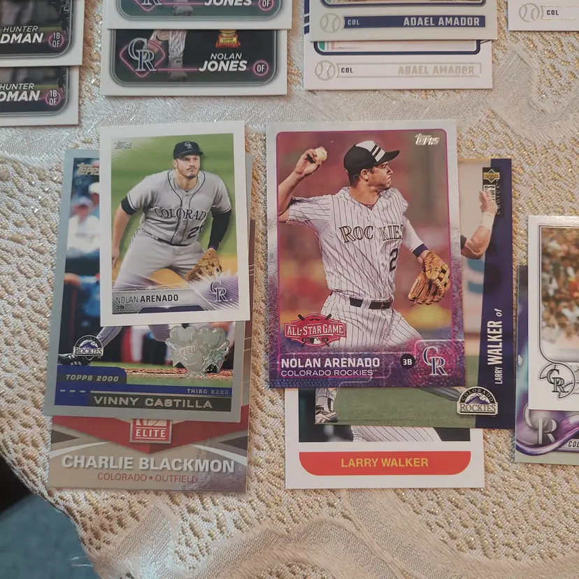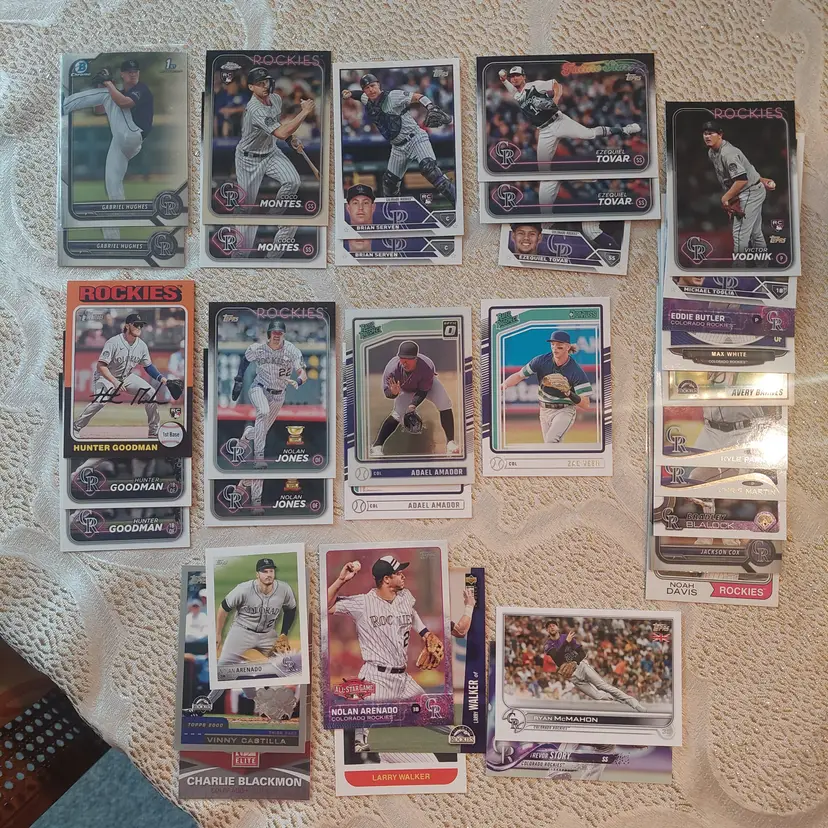 Players included in the lot: Nolan Arenado, Adael Amador. Charlie Blackmon, Bradley Blalock, Avery Barnes, Eddie Butler. Michael Cuddyer, Jackson Cox, Vinny Castilla. David Dahl, Noah Davis. Steve Finley. Carlos Gonzalez, Hunter Goodman. Gabriel Hughes. Nolan Jones, Jair Jurrjens. Chris Martin, Coco Montes, Ryan McMahon. Kyle Parker. Wilin Rosario. Trevor Story, Brian Serven. Troy Tulowitzki, Ezequiel Tovar, Michael Toglia. Zac Veen, Victor Vodnik. Larry Walker, Max White.