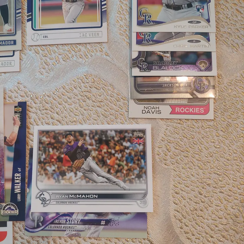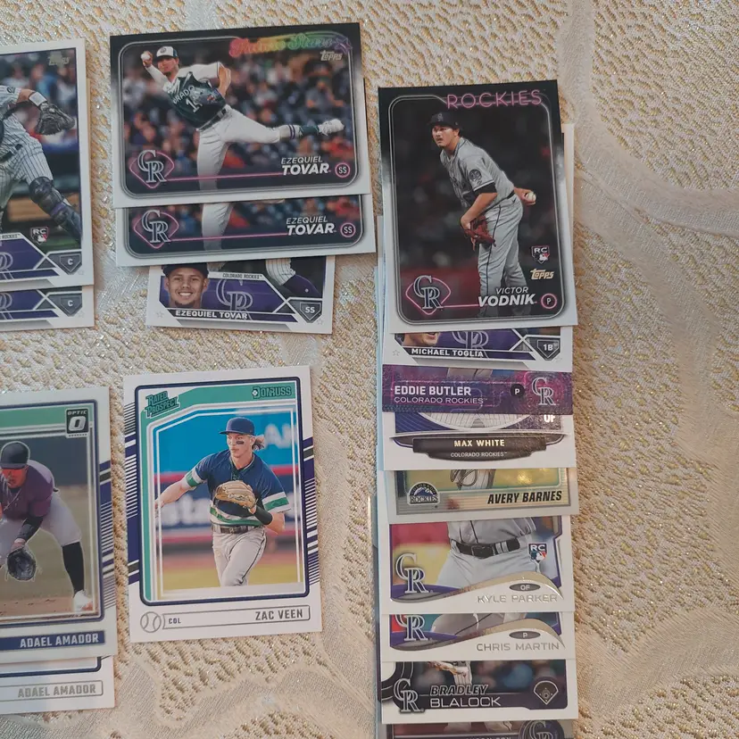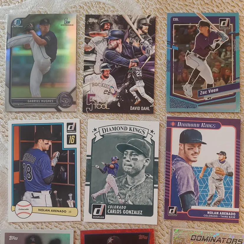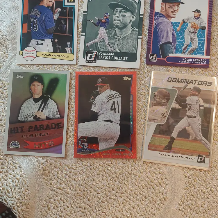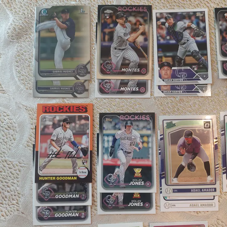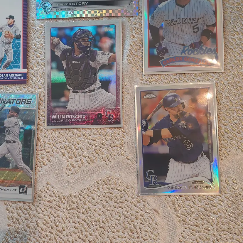 Players included in the lot: Nolan Arenado, Adael Amador. Charlie Blackmon, Bradley Blalock, Avery Barnes, Eddie Butler. Michael Cuddyer, Jackson Cox, Vinny Castilla. David Dahl, Noah Davis. Steve Finley. Carlos Gonzalez, Hunter Goodman. Gabriel Hughes. Nolan Jones, Jair Jurrjens. Chris Martin, Coco Montes, Ryan McMahon. Kyle Parker. Wilin Rosario. Trevor Story, Brian Serven. Troy Tulowitzki, Ezequiel Tovar, Michael Toglia. Zac Veen, Victor Vodnik. Larry Walker, Max White.