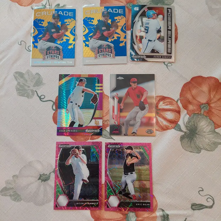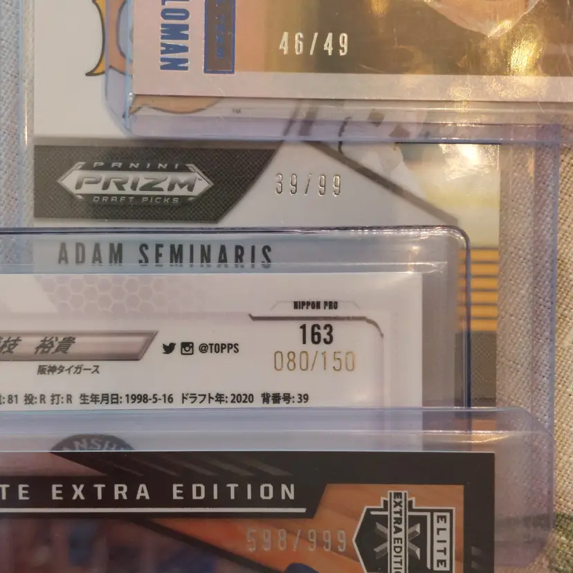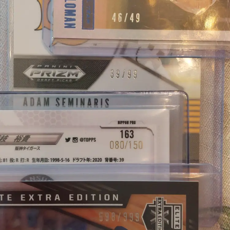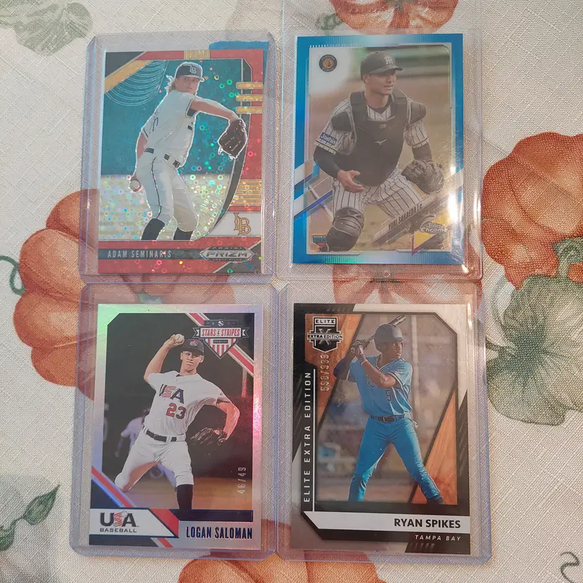 Logan Saloman #46/49. 2020 Panini USA Baseball Stars And Stripes. Adam Seminaris #39/99. 2020 Panini Prizm Draft Picks red donut circles Parallel. Yuki Sakaeda #80/150. 2021 Topps Chrome Nippon blue parallel. Ryan Spikes #598/999. 2021 Panini Elite Extra Edition.