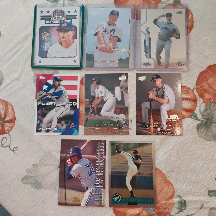 Corey Seager 2015 Panini USA Baseball Stars And Stripes diamond kings. Justin Smoak 2008 Upper Deck USA Baseball Insert. Brady Singer 2020 Topps Pro Debut Chrome. Marcus Stroman 2023 Topps world Baseball Classic Insert. Kyle Skipworth 2008 Upper Deck USA Baseball Insert. Jordan Swagerty 2008 Upper Deck USA Baseball Insert. Shannon Stewart 1994 classic best gold. Paul Shuey 1992 Classic bonus card. Justus Sheffield 2015 Panini USA Baseball Stars And Stripes crusade. Aaron Sabato 2020 Panini Prizm Draft Picks power surge Insert. Adam Seminaris 2020 Panini Prizm Draft Picks red purple Parallel. Noah Song 2020 Topps Pro Debut Chrome. Jacob Steinmetz 2021 Panini Prizm Draft Picks pink Velocity Parallel. Eric Silva 2021 Panini Prizm Draft Picks pink Velocity Parallel.