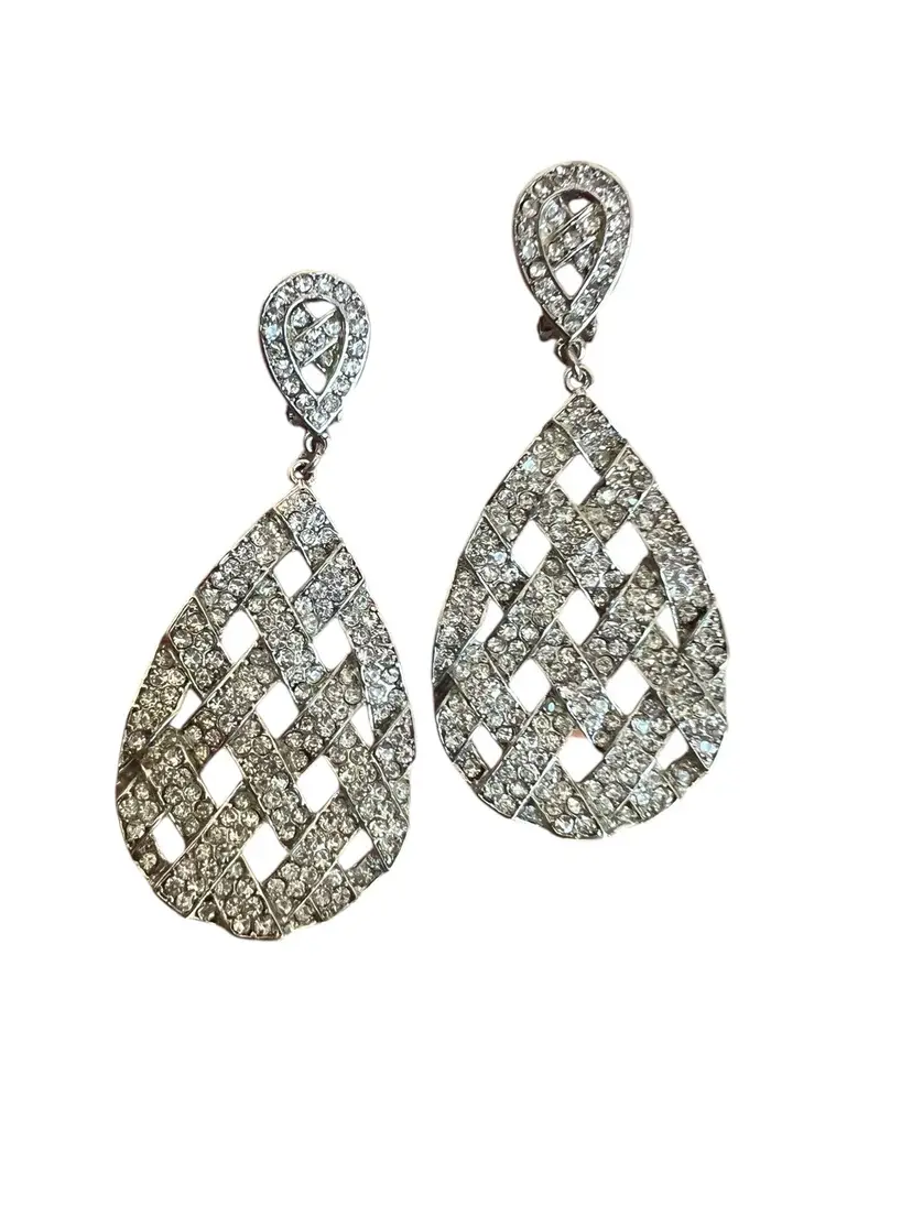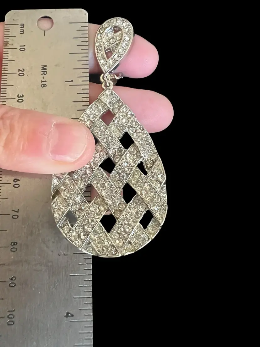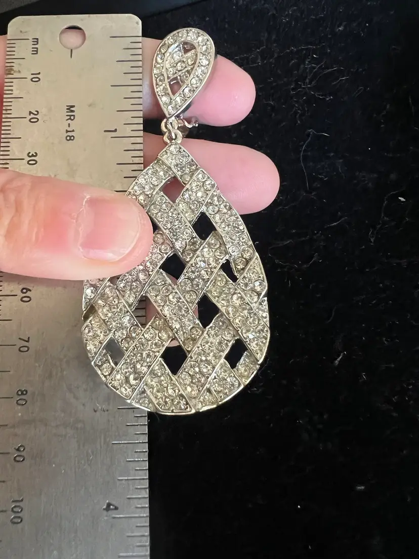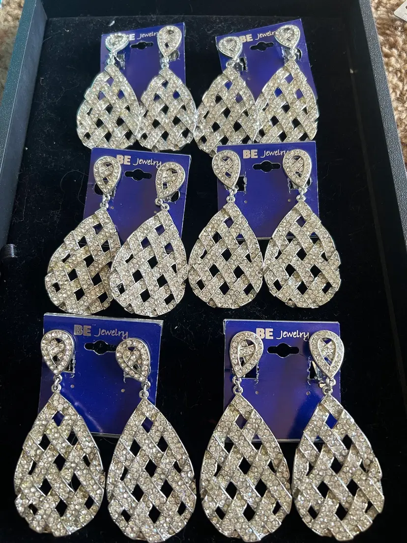 See photos for size and detail. Lot of 6 carded NOS dangle silver tone and clear rhinestone Basketweave teardrop earrings sets. Each pair is about 1.4 ounces