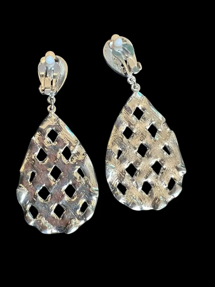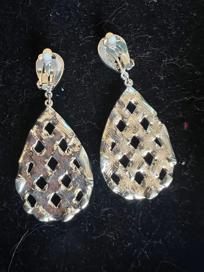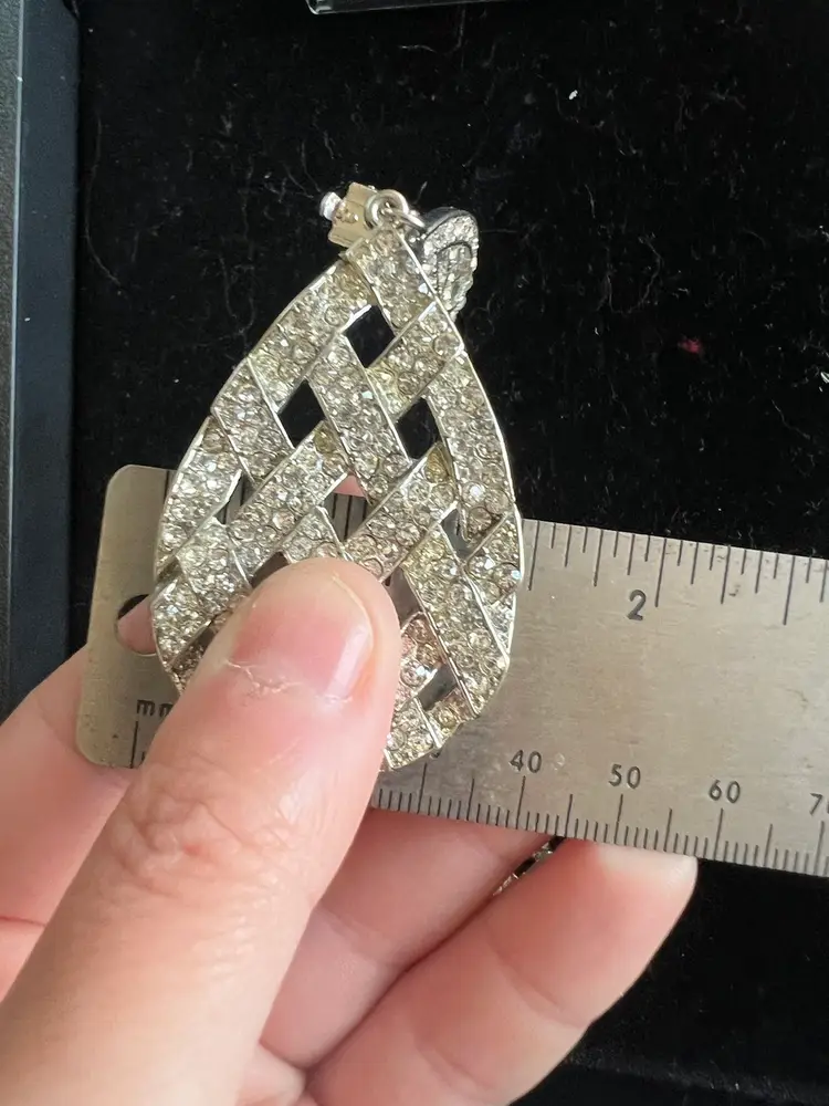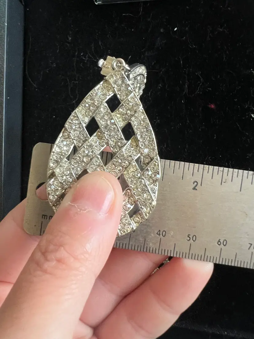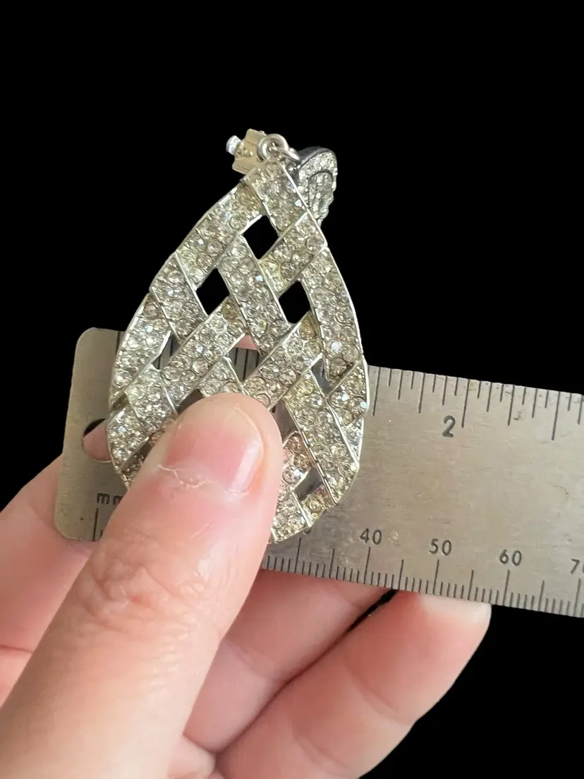 See photos for size and detail. Lot of 6 carded NOS dangle silver tone and clear rhinestone Basketweave teardrop earrings sets. Each pair is about 1.4 ounces