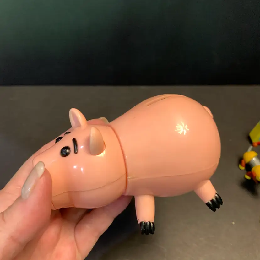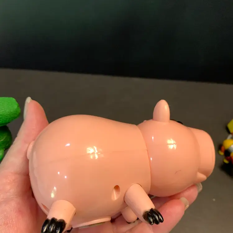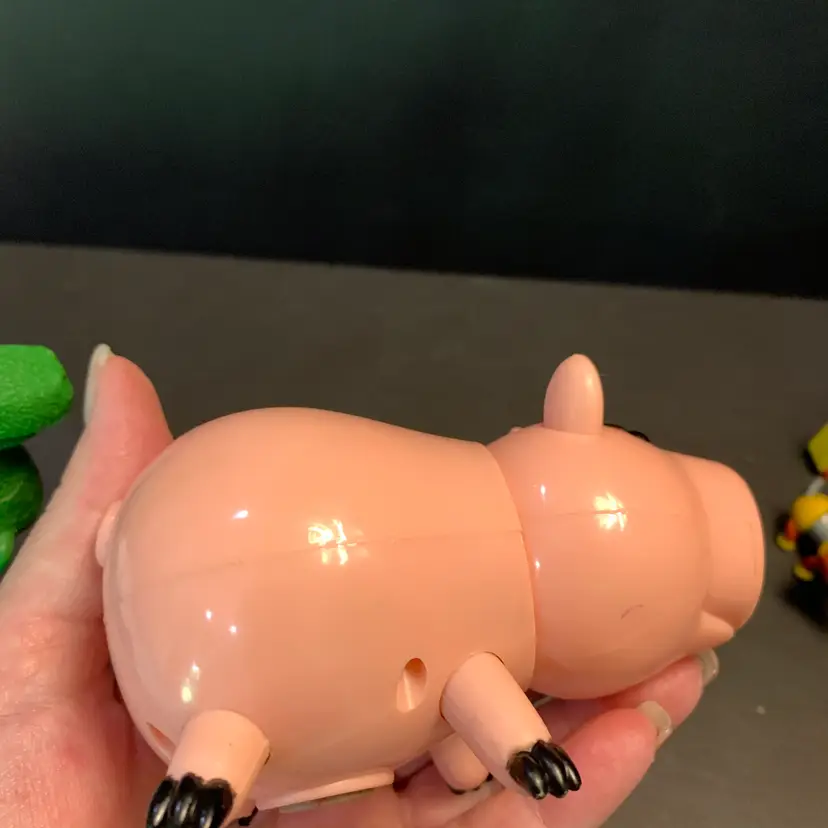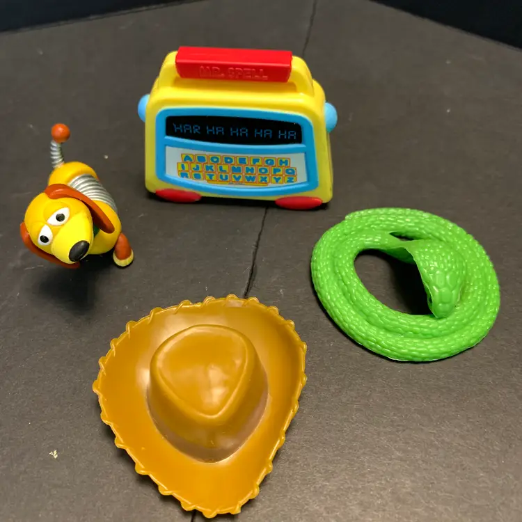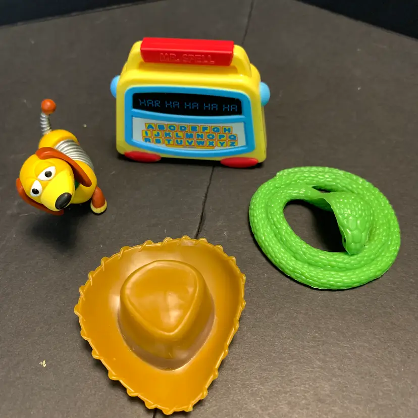 These were my oldest sons, and he did play with them. They may have some wear so please check out the photos. The bigger Woody measures 3 1/4 inches across, 2 inches wide and 6 1/2 inches tall. The smaller Woody measures 4 1/2 inches across, 1 1/2 inches wide and 4 3/4 inches tall. Rex measures 6 inches across, 3 inches wide and 5 inches tall. Hamm measures 4 1/4 inches across, 2 1/2 inches wide and 2 1/2 inches tall. Slinky Dog Measures 2 inches across, 3/4 inches wide and 1 1/4 inches tall. Mr. Spell measures 2 1/4 inches across, 1/2 inch wide and 2 inches tall. Weighs 9 ounces. If the actual postage ends up being less than what you paid, you will be refunded for anything over one dollar.