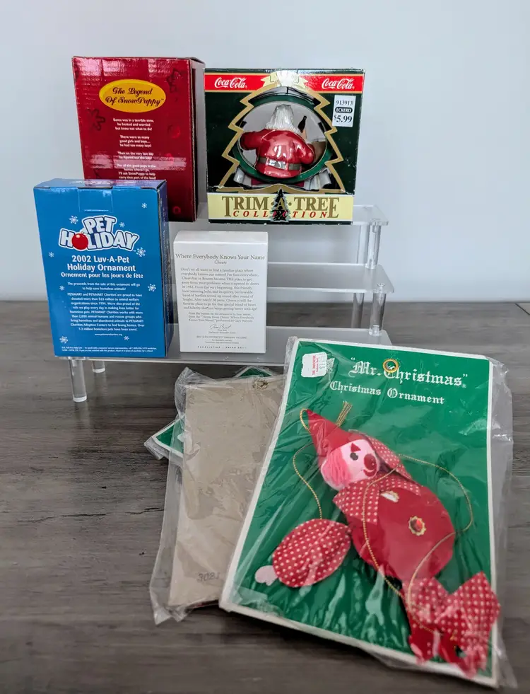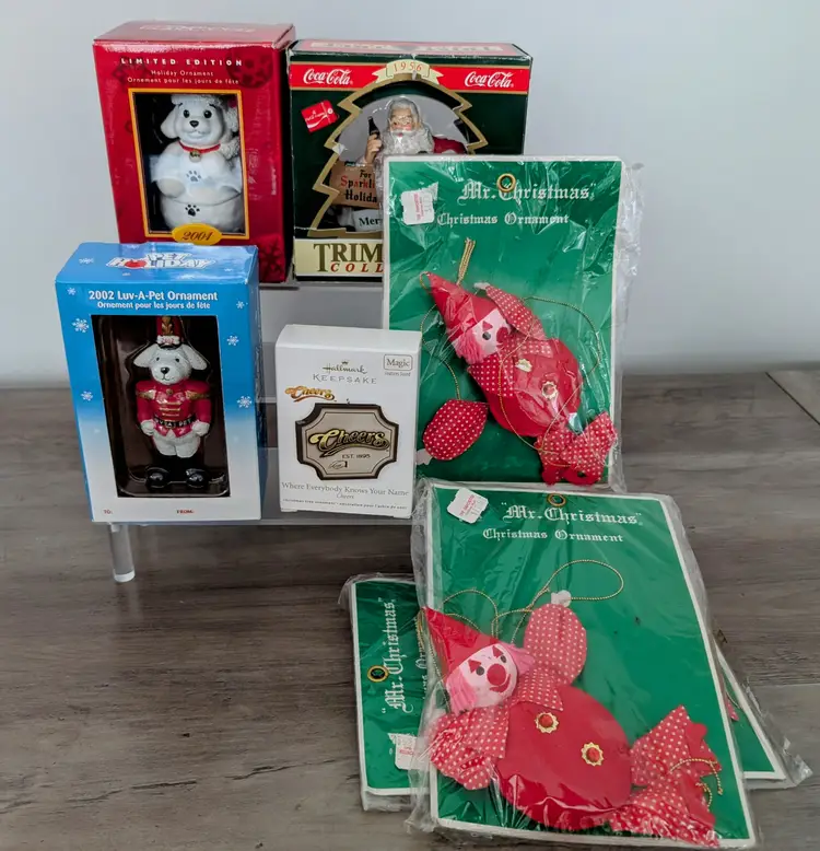 This listing is for a very nice lot of Christmas ornaments. There are 3 Mr. Christmas new old stock from the 60s elf/clown ornaments, 2 during Pet Smart Luv A Pet ornaments one from 2001 and the other from 2002, 90s Santa Workshop Coca Cola ornament and finally a Cheers music playing Hallmark Keepsake from 2011. The cheers ornament sells for $20 alone. It's tested and works. You'll just need a new battery. It's a really nice ornament. You should be able to make $80+ on the lot depending on how much the Mr. Christmas ornaments do. I think they would go for $15-20 each but I'm not sure. Thanks for checking out the lot. Happy bidding and merry early christmas!