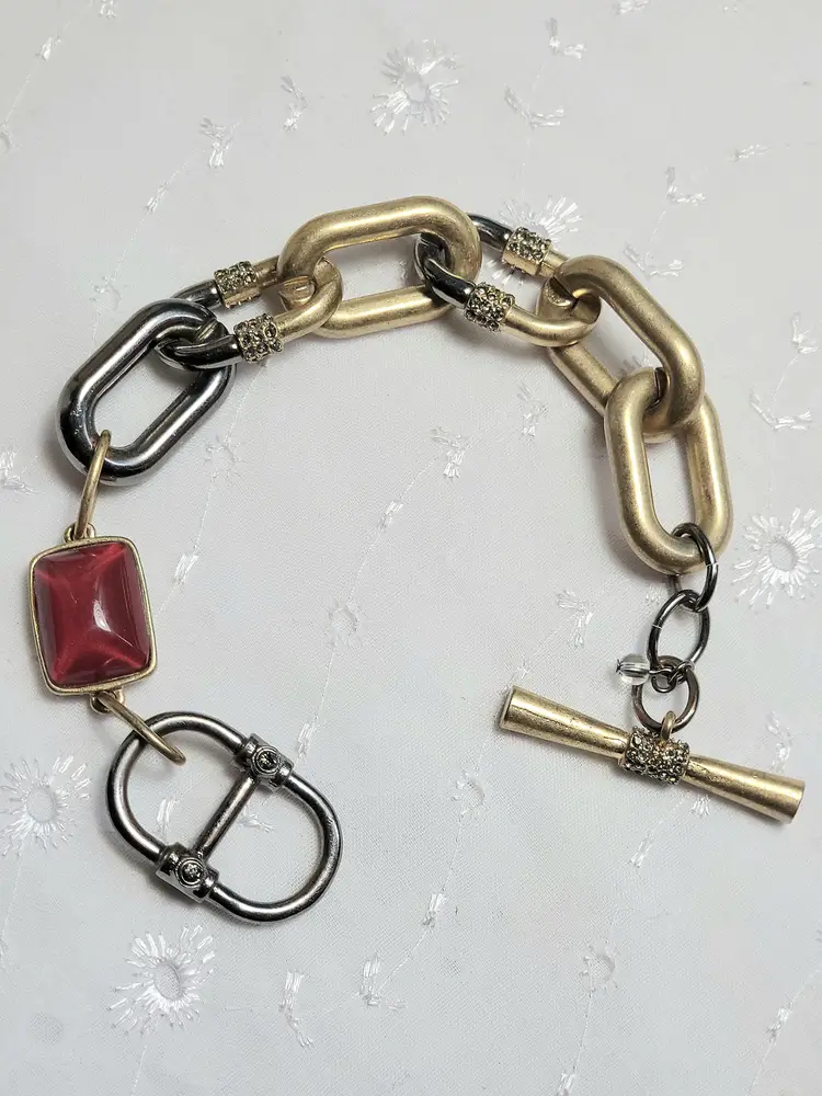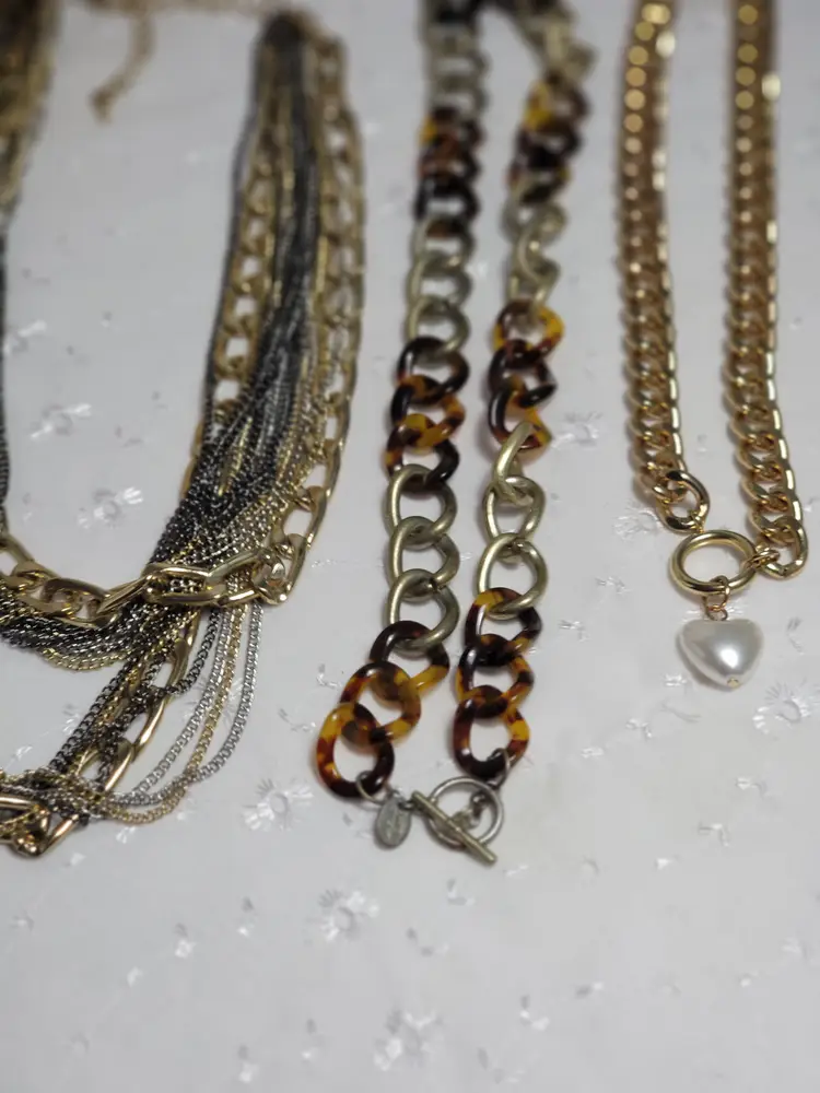 1 ~ tortoise shell chain necklace marked Danielle Steven's 1~ 18" 3 tone Multi-Strand chain necklace 1 ~ heavy goldtone chain necklace with heart shape faux pearl charm 1~ gold chain and toggle with rhinestones 1 ~ classic silvertone chain with heart charm 16" 1 ~ Lauren Burch two tone chain 16" ☆ Total of 1 pound ☆ And 2 bracelets
