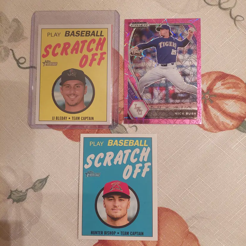 JJ Bleday 2020 Topps heritage Minors scratch off Insert. Hunter Bishop 2020 Topps heritage Minors scratch off Insert. Nick Bush 2021 Panini Prizm Draft Picks pink Velocity Parallel.