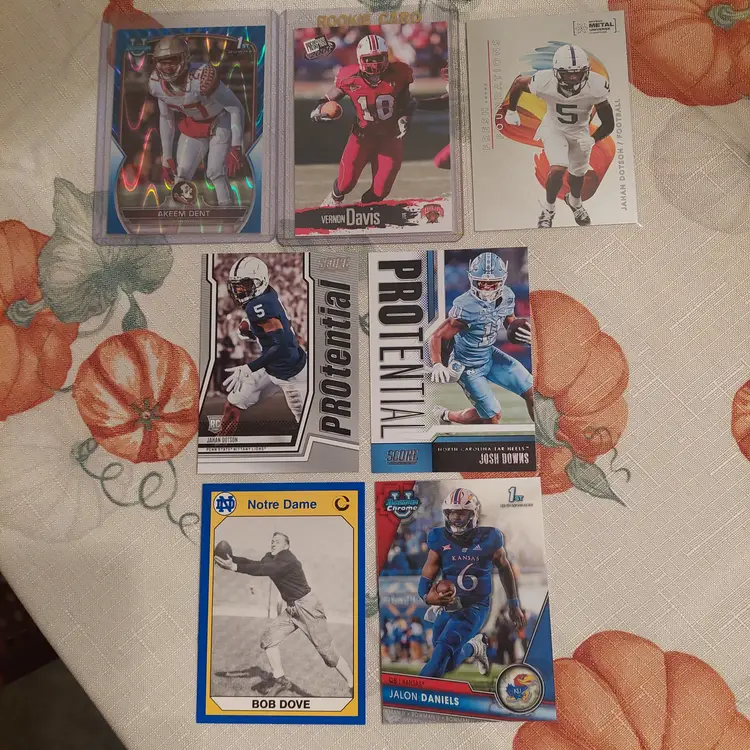 Akeem Dent #152/199. 2022 Bowman Chrome University blue raywave Refractor. 1st Bowman. Vernon Davis 2006 Press pass. Jalon Daniels 2023 Bowman Chrome University 1st Bowman. Jahan Dotson 2022 Skybox Metal Universe Champions fresh Foundations Insert. Jahan Dotson 2022 Panini Score Protential Insert. Josh Downs 2023 Panini Score Protential Insert. Bob Dove 1990 Notre Dame Collegiate collection.