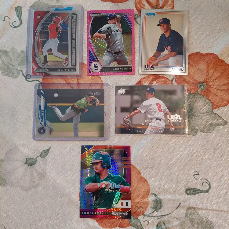 CJ Van Eyk 2020 Panini Prizm Draft Picks silver Parallel. Austin Wells 2020 Panini Prizm Draft Picks power surge Insert. Jordan Wicks 2021 Panini Prizm Draft Picks pink Velocity Parallel. T.J. Walz 2010 Bowman Chrome USA Baseball Insert. Forrest Whitley 2020 Topps Pro Debut Chrome. Ryan Weber 2008 Upper Deck USA Baseball Insert. Freddy Zamora 2020 Panini Prizm Draft Picks red purple Parallel.