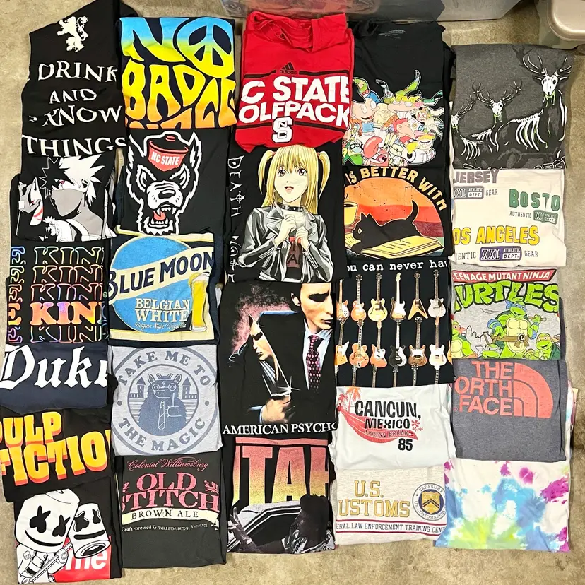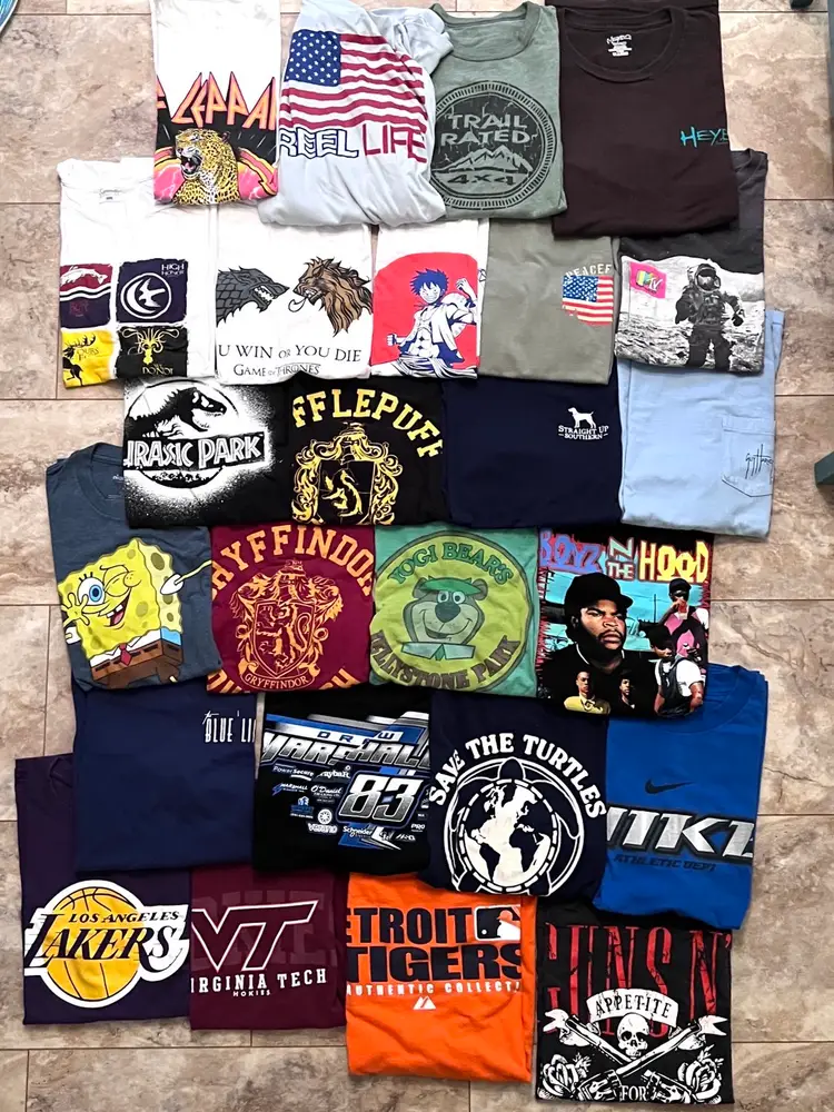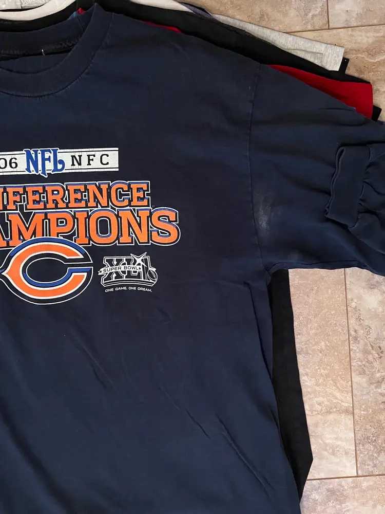 75 shirts, variety of styles and sizes- adult sizing S-3XL (can’t recall if any were 4x+ but I don’t think so) with a good mix. A few long sleeve. Small discoloration on the sleeves of the Utah tee (last photos) and the long sleeve bears. First group of tees (1st still photo) were already folded and didn’t want to unfold to take another video to save on some of the labor. 2nd video and 2nd grouping of tees is the same 25 pieces - just in both mediums. All have been washed except the nwt and the autograph Big Tom one. Will ship UPS so non-po box address needed for checkout.