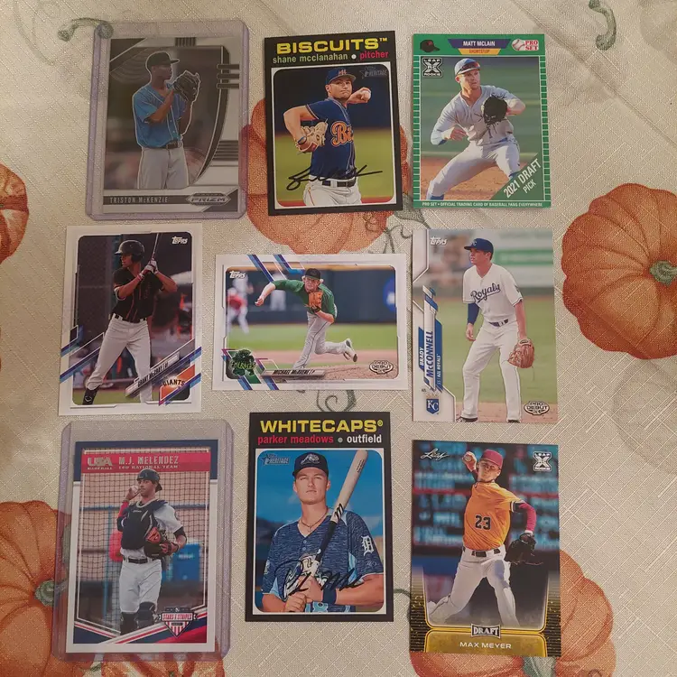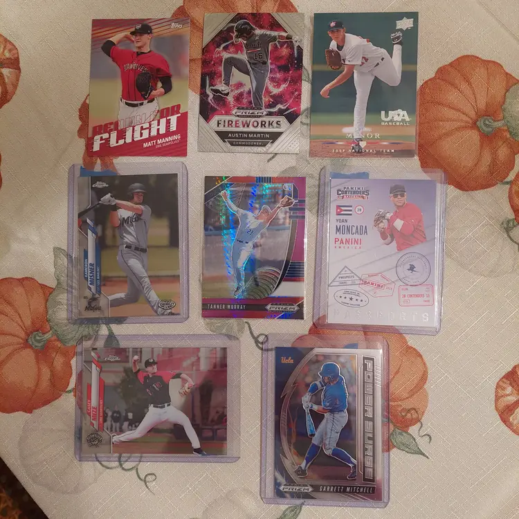Casey Mize 2020 Topps Pro Debut Chrome. Garrett Mitchell 2020 Panini Prizm Draft Picks power surge Insert. Yoan Moncada 2019 Panini Contenders passports Insert. Matt Manning 2020 Topps Pro Debut ready for flight Insert. Austin Martin 2020 Panini Prizm Draft Picks fireworks Insert. Mike Minor 2008 Upper Deck USA Baseball Insert. Kameron Misner 2020 Topps Pro Debut Chrome. Tanner Murray 2020 Panini Prizm Draft Picks red purple hyper.