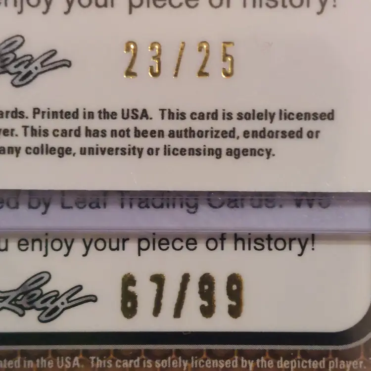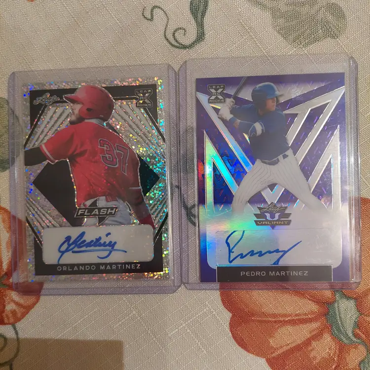 Pedro Martinez Auto. #23/25. 2020 Leaf Valiant purple Parallel. Orlando Martinez Auto. #67/99. 2021 Leaf Flash.