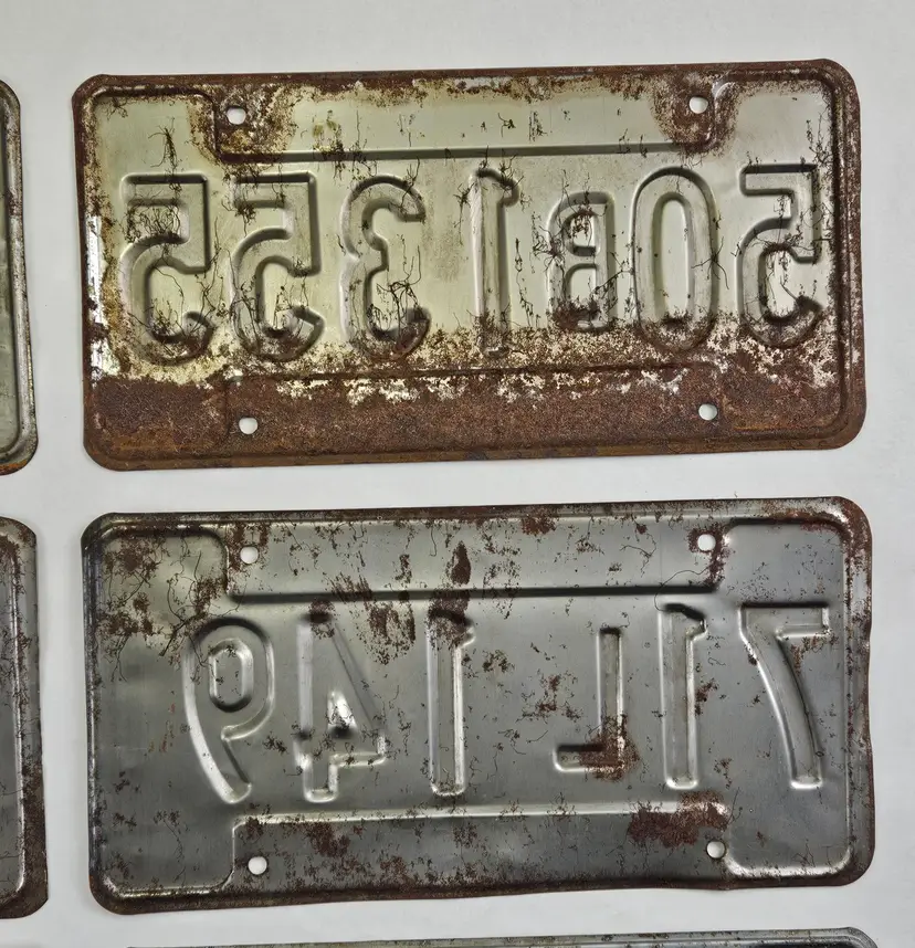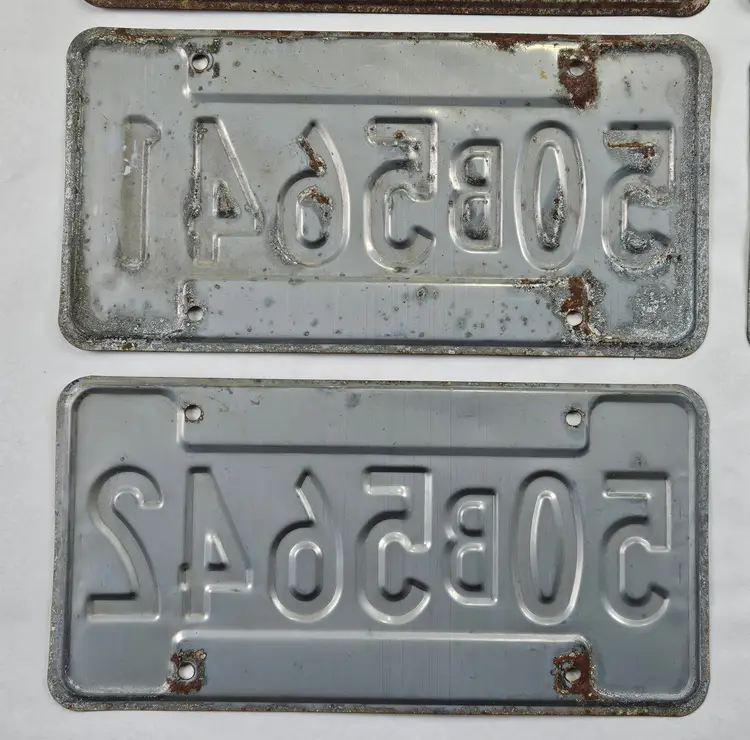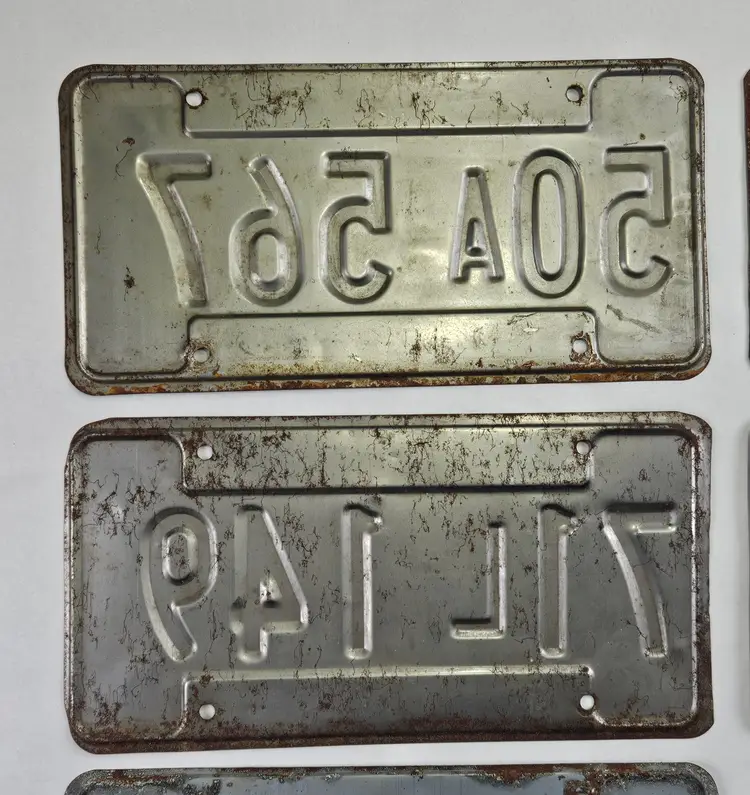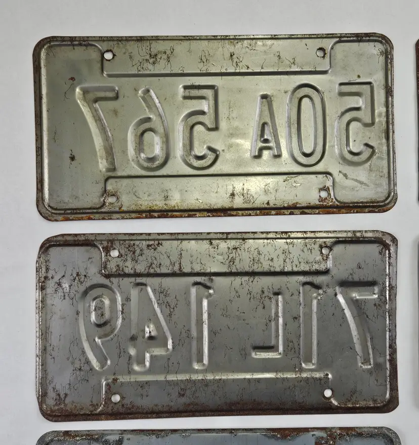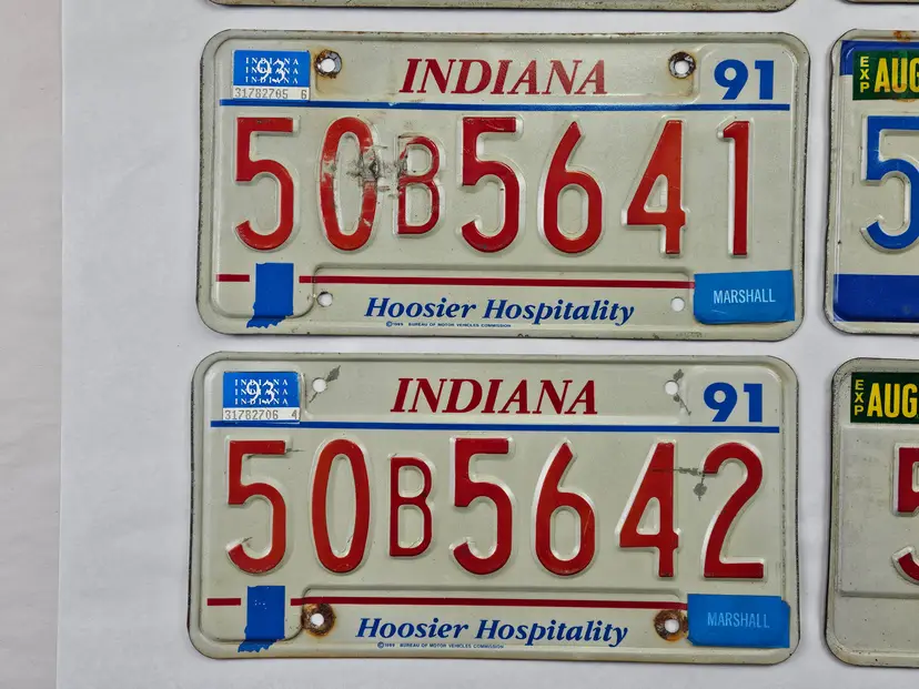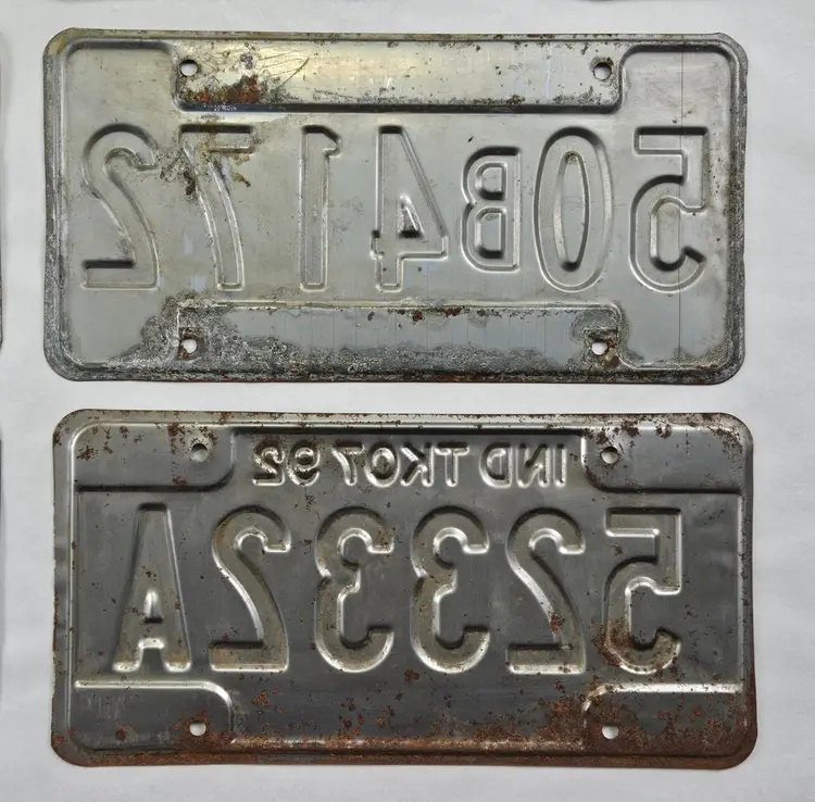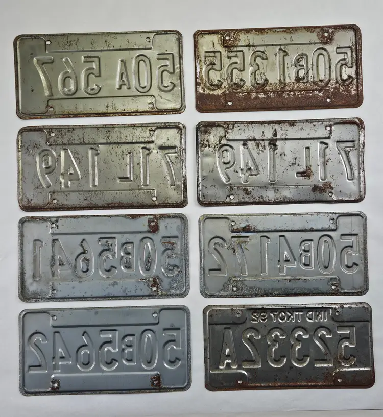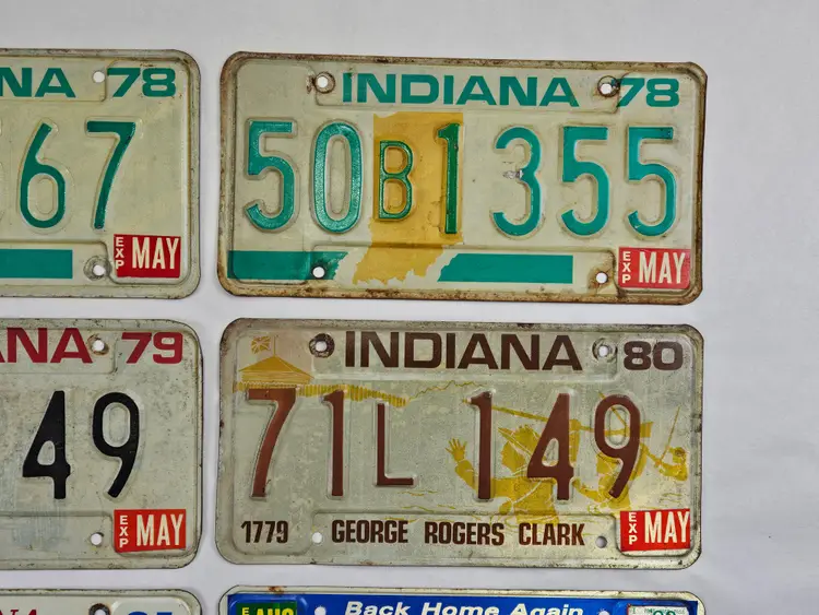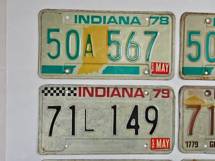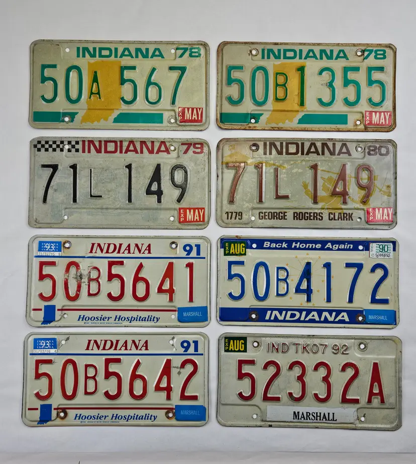 You are buying a Lot of 8 Indiana State Metal License Plates from the Late 70s to Early 90s. Overall, they are in used but not abused pre-owned condition with cosmetic wear present from age and usage.