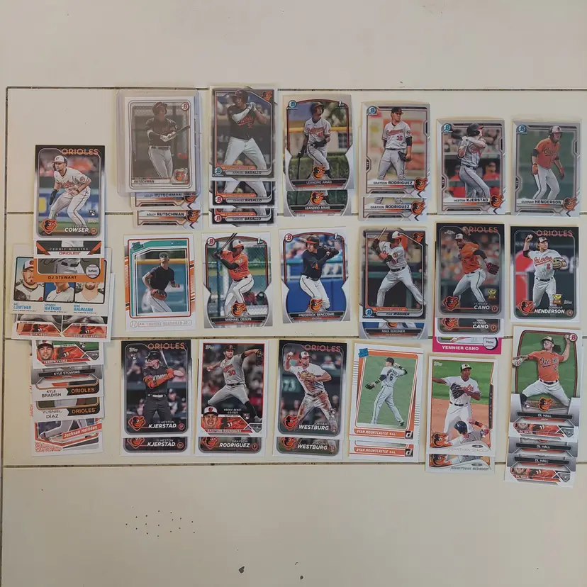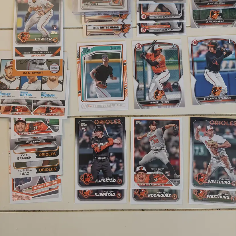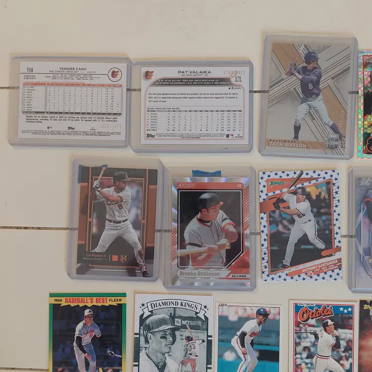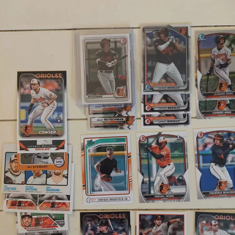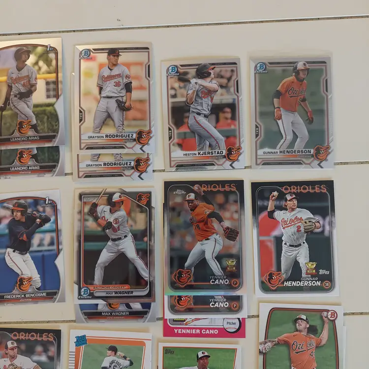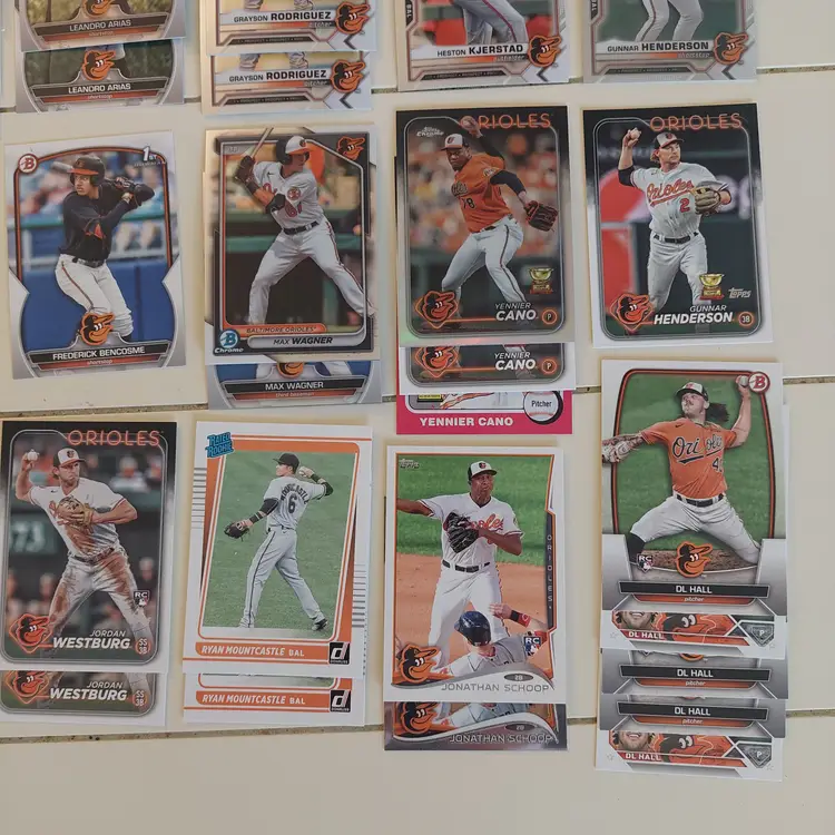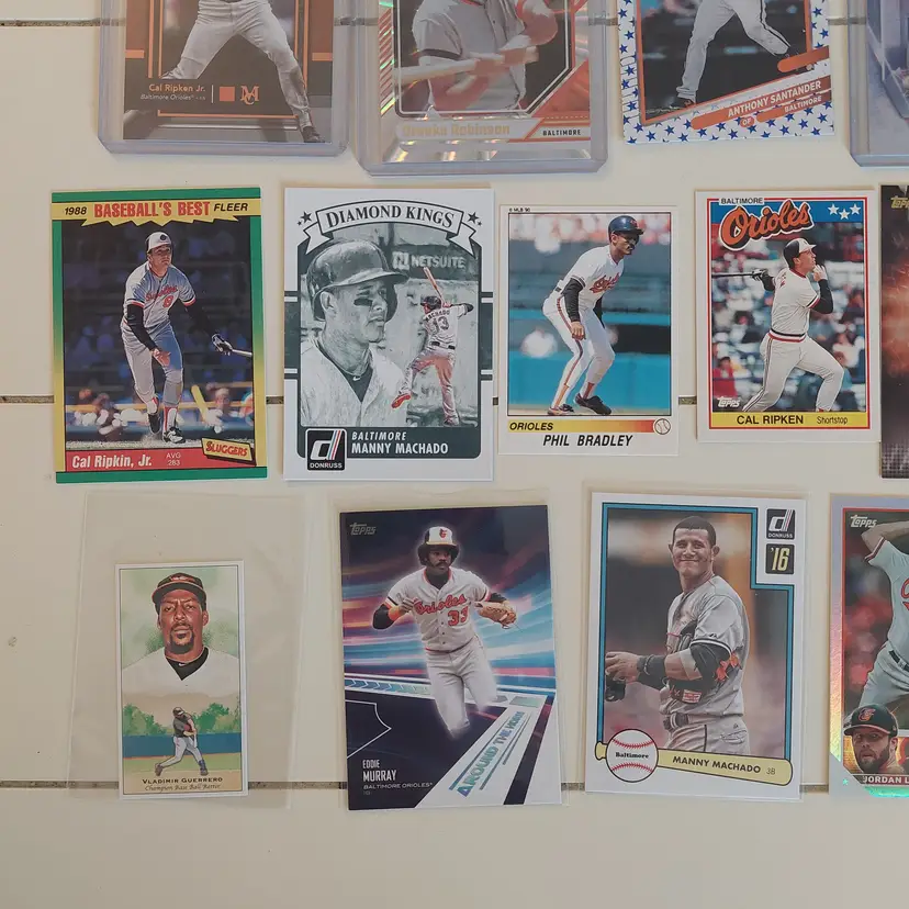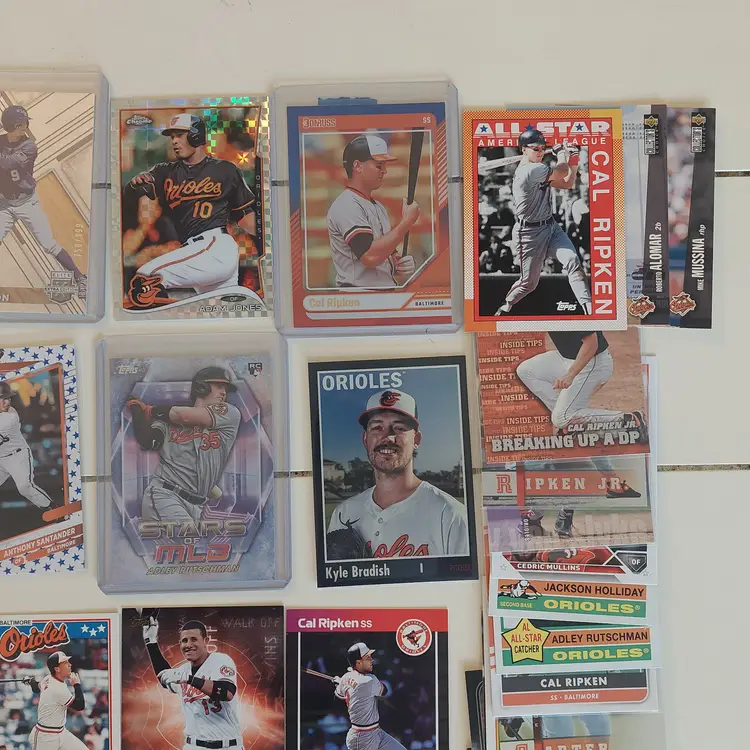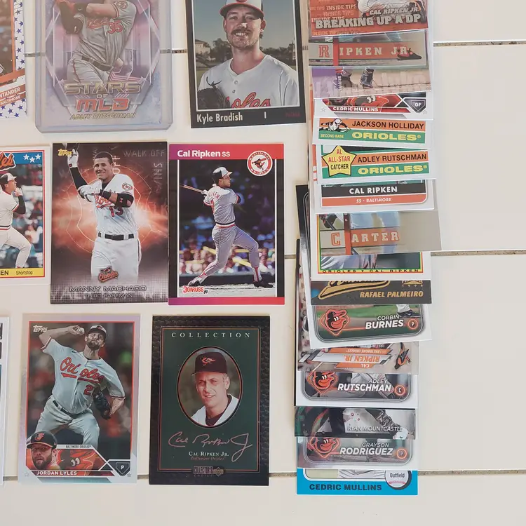 Players included in the lot: Leandro Arias, Roberto Alomar. Kyle Bradish, Samuel Basallo, Corbin Burnes, Phil Bradley, Frederick Bencosme, Enrique Bradfield, Jr. Colton Cowser, Yennier Cano, Joe Carter. Yusniel Diaz, Mishael Deson. Vladimir Guerrero. Jackson Holliday, Gunnar Henderson, DL Hall. Adam Jones. Heston Kjerstad. Jordan Lyles. Manny Machado, Eddie Murray, Cedric Mullins, Ryan Mountcastle, Mike Mussina. Rafael Palmeiro. Cal Ripken Jr., Adley Rutschman, Brooks Robinson, Grayson Rodriguez. Anthony Santander, Kyle Stowers, DJ Stewart, Jonathan Schoop. Terrin Vavra, Andy Van Slyke. Max Wagner, Jordan Westburg.