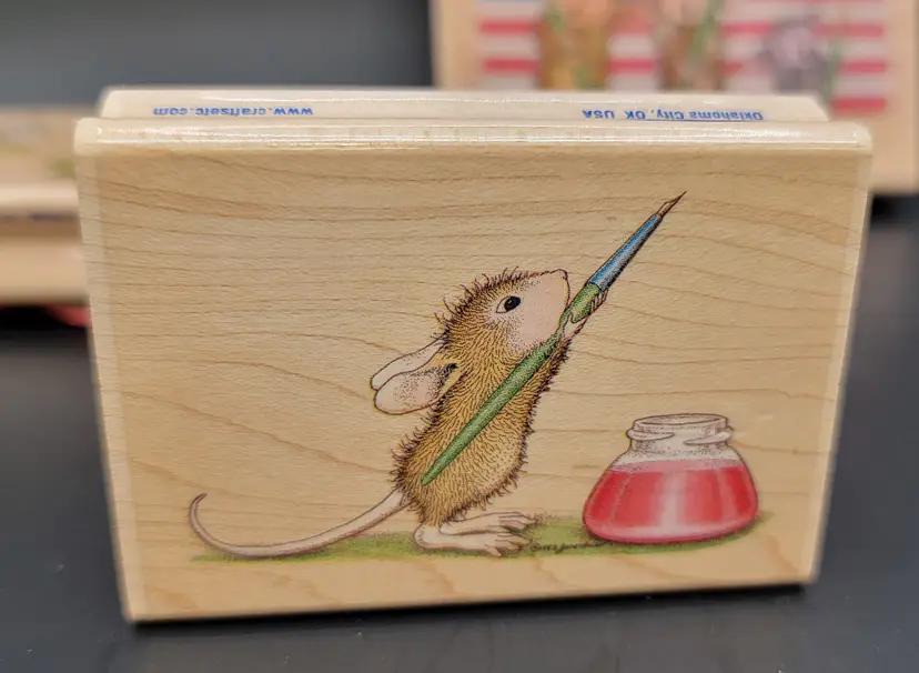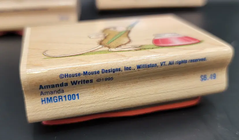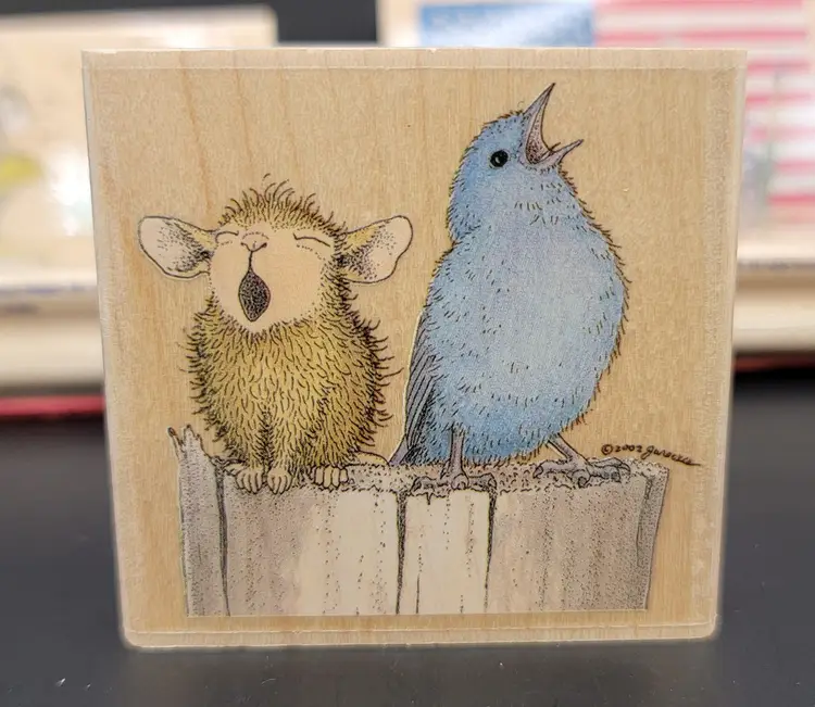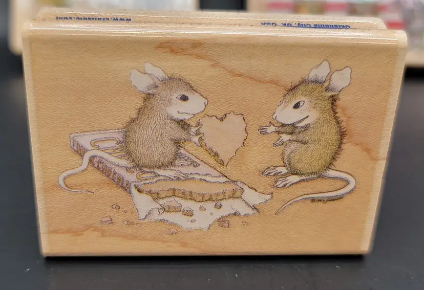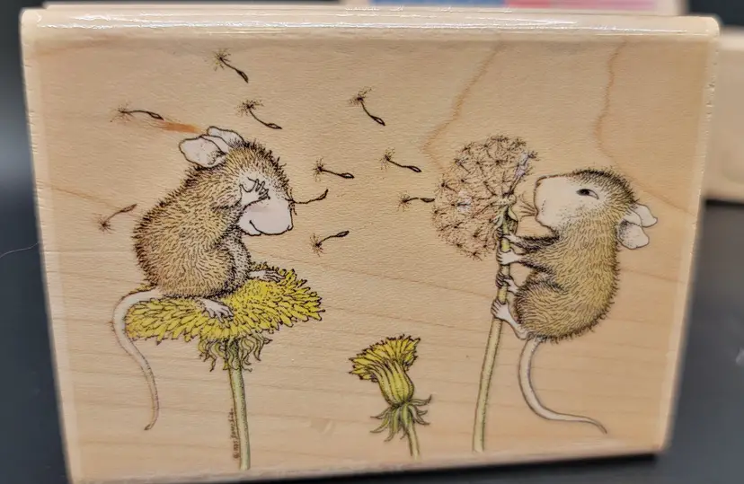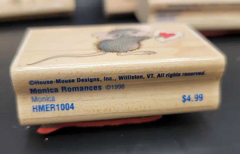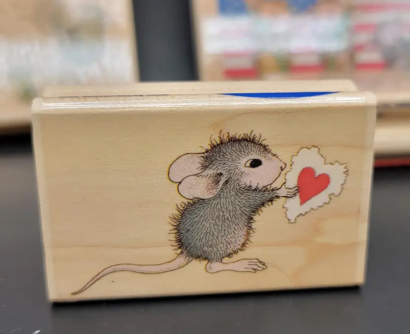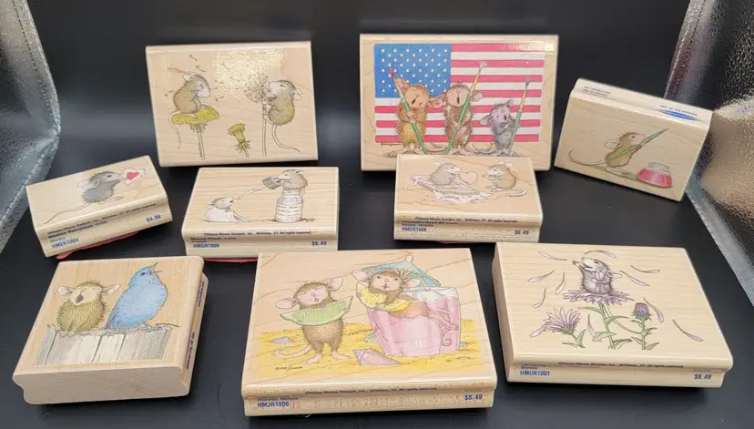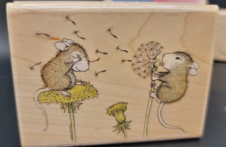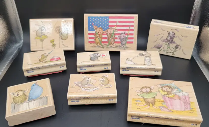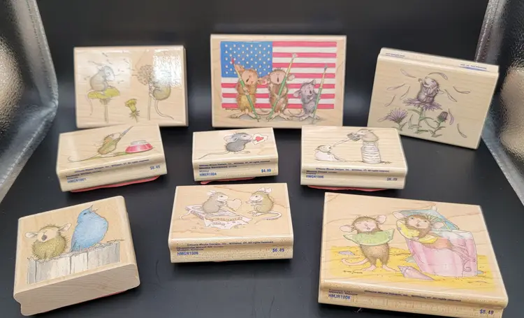 This is a lot of 9 stamps. House Mouse designs Stampabilites wood mounted rubber stamps. All stamps are in clean vintage condition. 3 of the stamps have dry ink smears on the wood and are lightly used. All the others are in clean new old stock condition. Please see all photos. (1) Monica Romances 1996-2003 - 2 1/2inches x1 1/2inches - new old stock (1) Chocolate heart 1993-2004 - 3 inch x2 inch - new old stock (1) two part harmony 2002-2004 - 2 1/2 inches x 2 1/2 inches - new old stock (1) Blowing Dandelions 1989-2003 - 3 3/4 inches x2 3/4 inches - new old stock (1) Mouse Drops 1986-2004 - 3 inches x 2 inches - new old stock (1) Show your colors 2002-2003 - 4 1/2 inches x 3 inches - new old stock (1) Amanda writes 1995-2003 - 3 inches x 2 inches - vintage used (1) Throwing Daisy Petals 1993-2003 - 3 1/2 inches x 2 3/4 inches - vintage used (1) Lemon Lips 1999-2003 - 4 inches x 3 inches - vintage used These are so cute and fun.