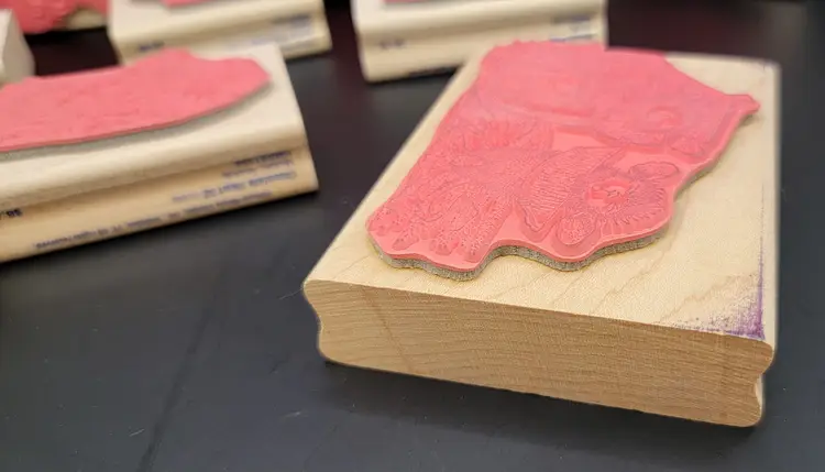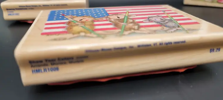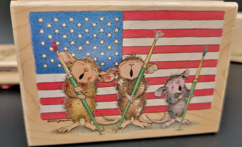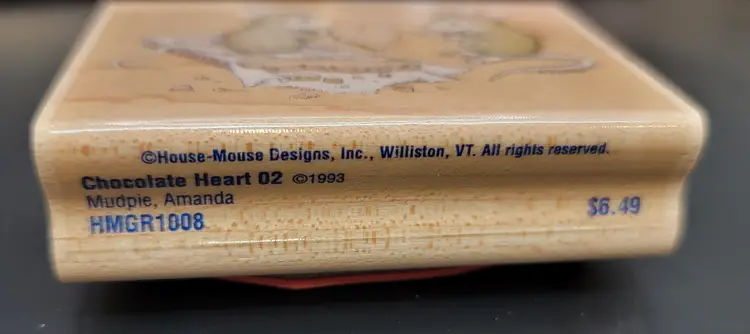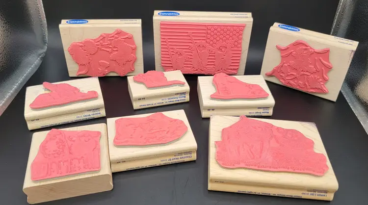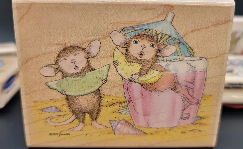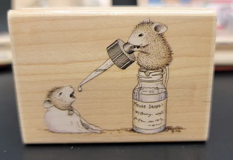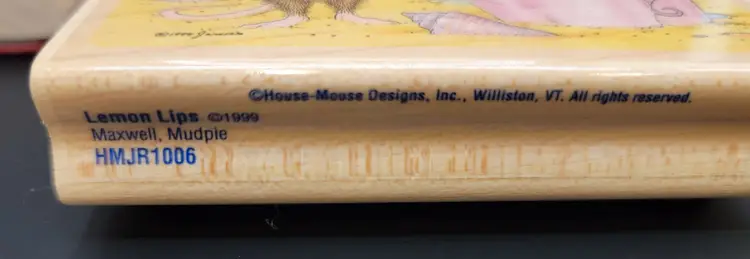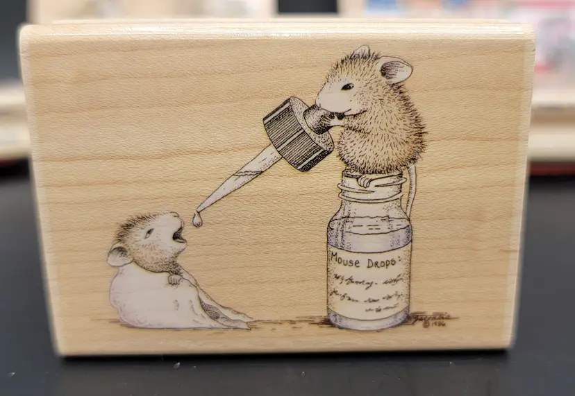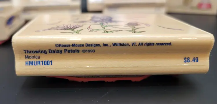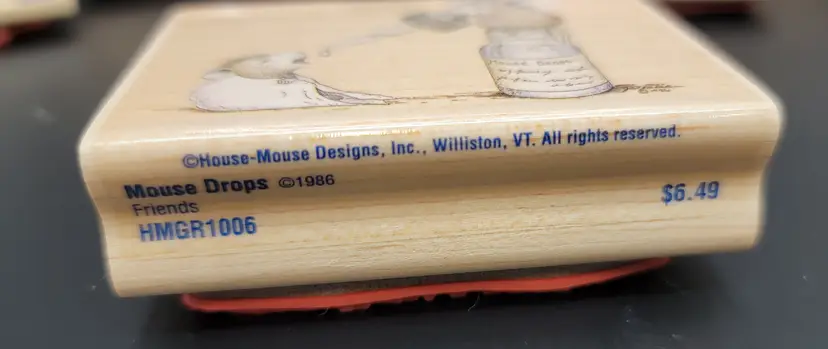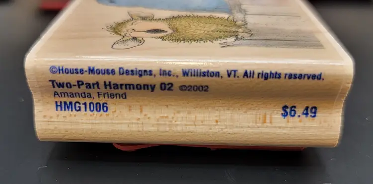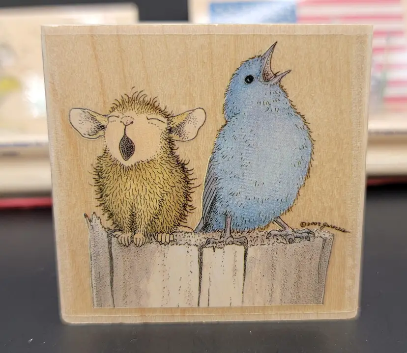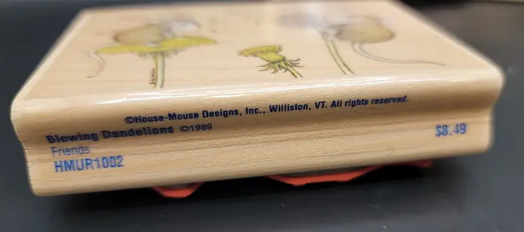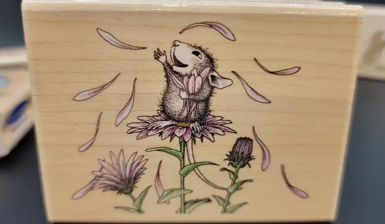 This is a lot of 9 stamps. House Mouse designs Stampabilites wood mounted rubber stamps. All stamps are in clean vintage condition. 3 of the stamps have dry ink smears on the wood and are lightly used. All the others are in clean new old stock condition. Please see all photos. (1) Monica Romances 1996-2003 - 2 1/2inches x1 1/2inches - new old stock (1) Chocolate heart 1993-2004 - 3 inch x2 inch - new old stock (1) two part harmony 2002-2004 - 2 1/2 inches x 2 1/2 inches - new old stock (1) Blowing Dandelions 1989-2003 - 3 3/4 inches x2 3/4 inches - new old stock (1) Mouse Drops 1986-2004 - 3 inches x 2 inches - new old stock (1) Show your colors 2002-2003 - 4 1/2 inches x 3 inches - new old stock (1) Amanda writes 1995-2003 - 3 inches x 2 inches - vintage used (1) Throwing Daisy Petals 1993-2003 - 3 1/2 inches x 2 3/4 inches - vintage used (1) Lemon Lips 1999-2003 - 4 inches x 3 inches - vintage used These are so cute and fun.