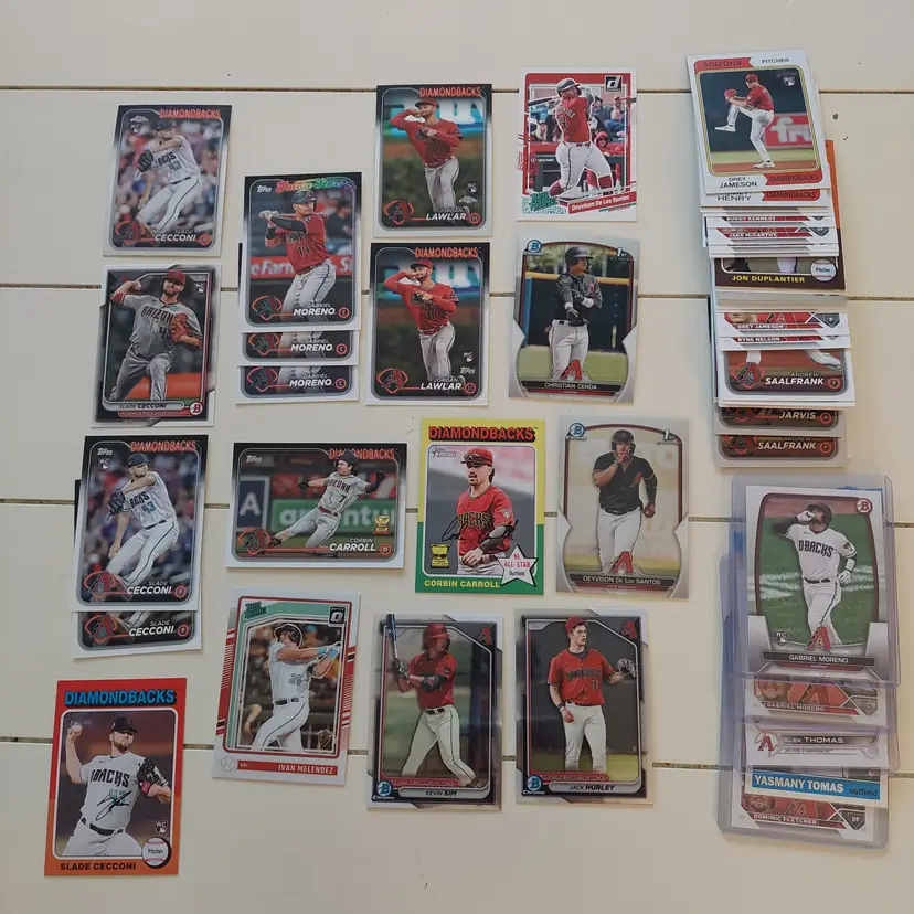 Players included in the lot: Chase Anderson. Silvino Bracho. Slade Cecconi, Corbin Carroll, Christian Cerda. Jon Duplantier, Deyvison De Los Santos, Brandon Drury. Dominic Fletcher, Ronnie Freeman. Zac Gallen, Paul Goldschmidt, Luis Gonzalez, Tuffy Gosewisch. Tommy Henry, Jack Hurley. Bryce Jarvis, Drey Jameson, Randy Johnson. Buddy Kennedy. Jordan Lawlar, Jake Lamb. Gabriel Moreno, Ketel Marte, Justin Martinez, Wade Miley, Jake Mccarthy, Ivan Melendez. Ryan Nelson. Chris Owings. A.J. Pollock. Donny Racz. Andrew Saalfrank, Kevin Sim. Tommy Troy, Yasmany Tomas, Alek Thomas. Christian Walker, Matt Williams, Brandon Webb. Daulton Varsho.