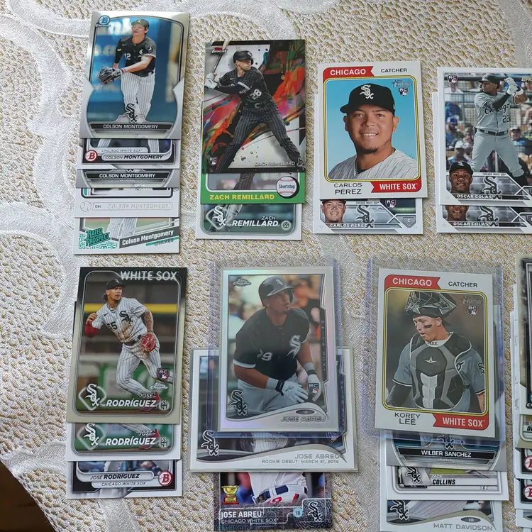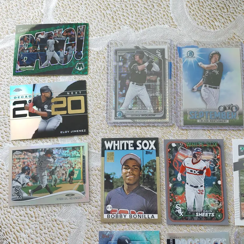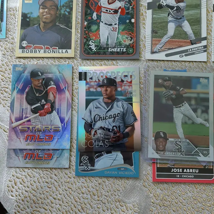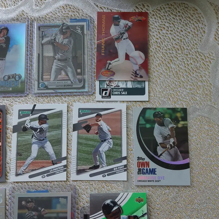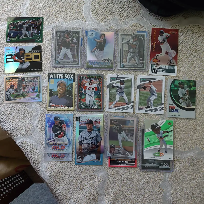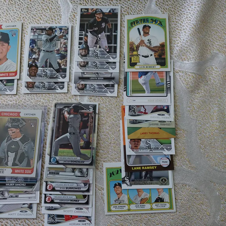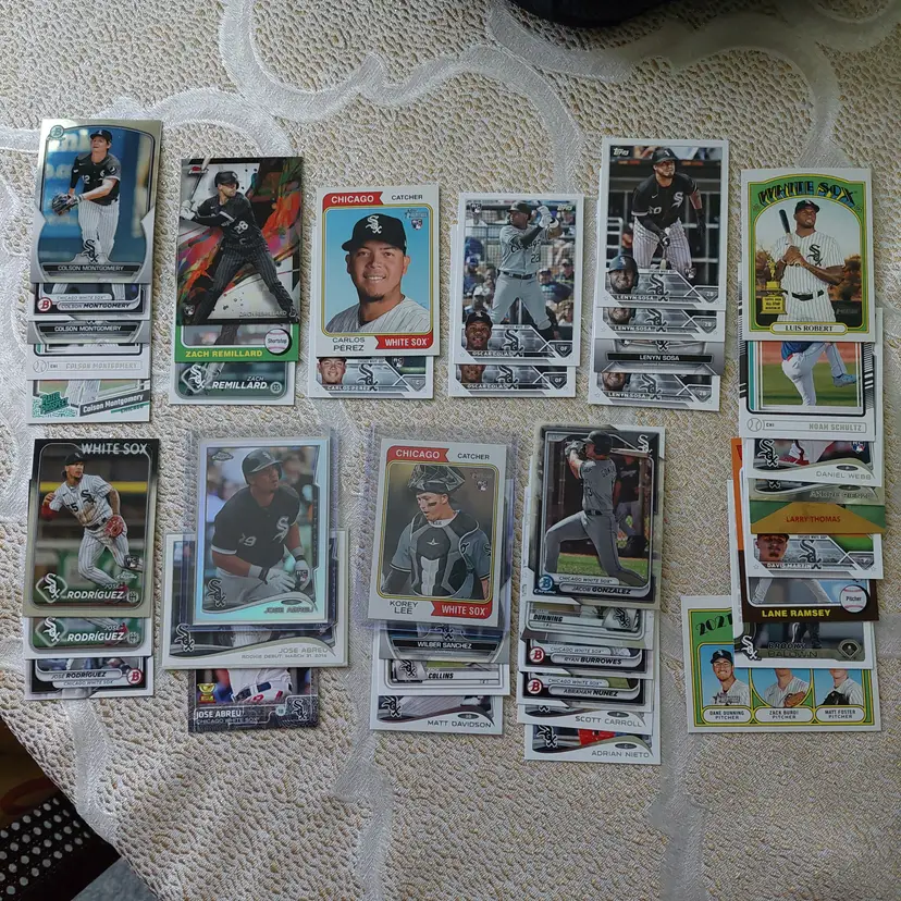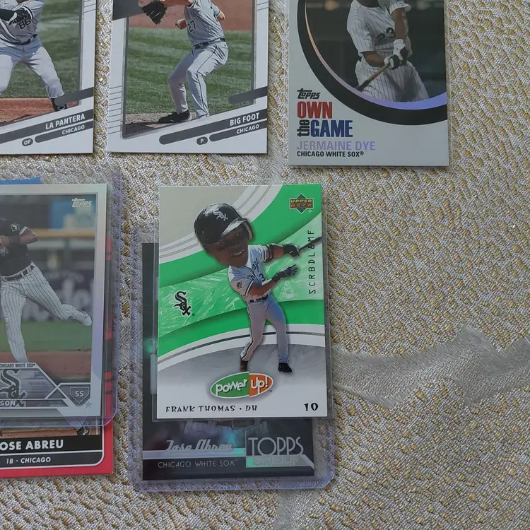 Players included in the lot: Jose Abreu, Tim Anderson. Bobby Bonilla, Jacob Burke, Brooks Baldwin, Ryan Burrowes. Oscar Colas, Dylan Cease, Zack Collins, Scott Carroll. Jermaine Dye, Dane Dunning, Matt Davidson. Carlton Fisk. Lucas Giolito, Avisail Garcia, Jacob Gonzalez, Leury Garcia. Eloy Jimenez, Bo Jackson. Korey Lee. Colson Montgomery, Davis Martin. Abraham Nunez, Adrian Nieto, Omar Narvaez. Carlos Perez. Luis Robert, Lane Ramsey, Andre Rienzo, Jose Rodriguez, Zach Remillard, Tim Raines. Chris Sale, Gavin Sheets, Noah Schultz, Lenyn Sosa, Wilber Sanchez. Frank Thomas, Larry Thomas. Dayan Viciedo. George Wolkow, Daniel Webb.