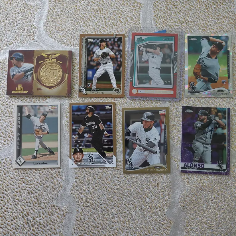 Jose Abreu medallion card. Donn Pall Spanish SSP. Andre Rienzo #8/10. Colson Montgomery #231/275. Yonder Alonso #25/299. Leury Garcia #1391/2014. Jake Burger #407/2023. Drew Thorpe #999/2025.