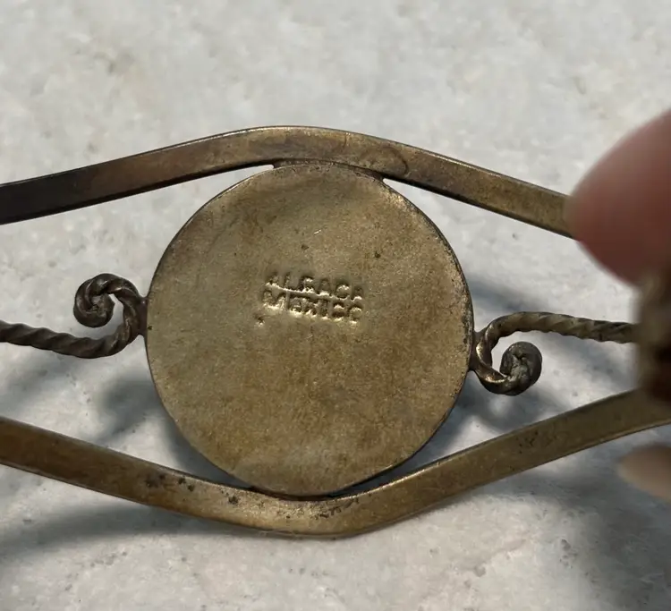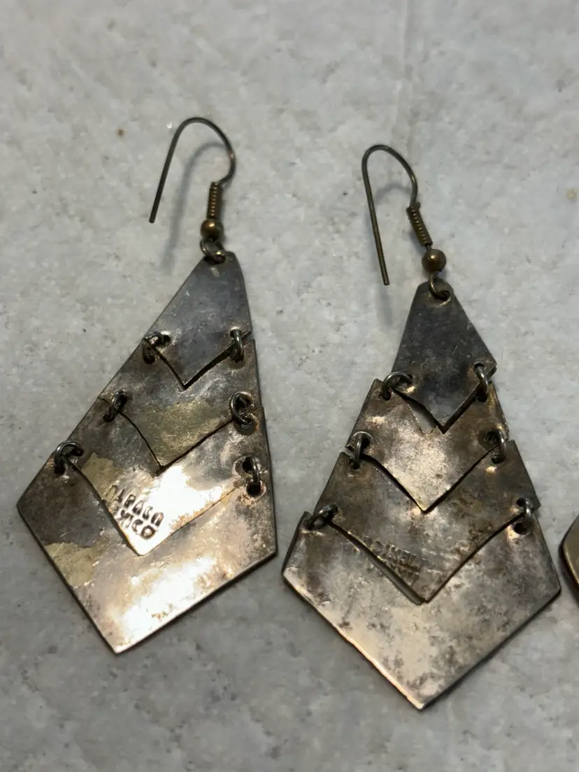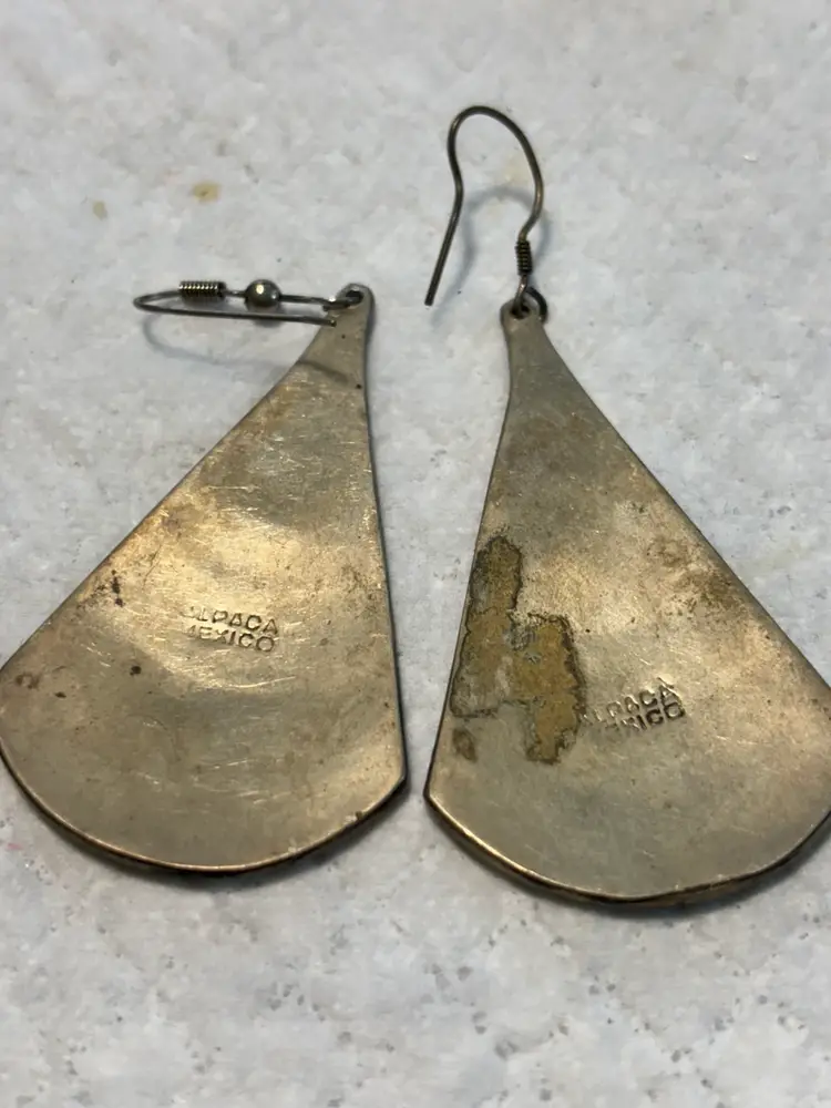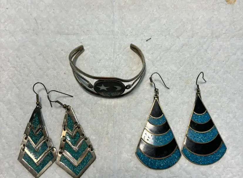 This is from an estate. Very Southwestern looking jewelry. There’s a small alpaca cuff bracelet with abalone, onyx and MOP inlay. Two pair of dangle earrings with what looks like crushed Turquoise. The bracelet is approximately 6 1/2 inches, maybe a tad smaller. Both pair of earrings measure about 3 inches long, including the French wire.