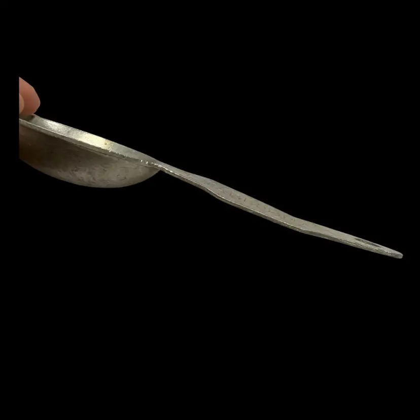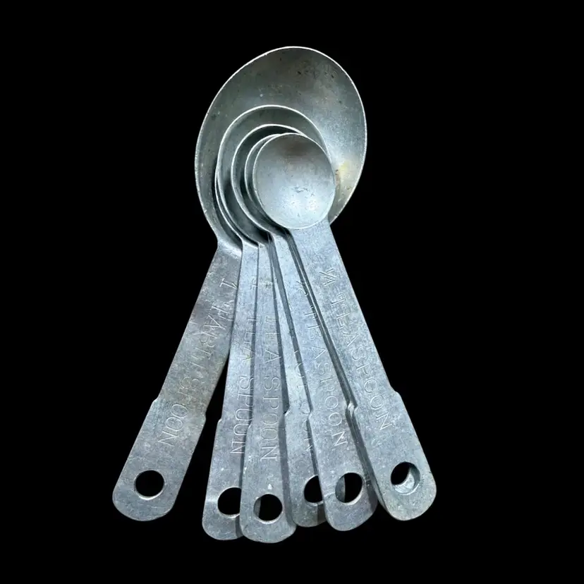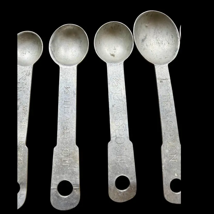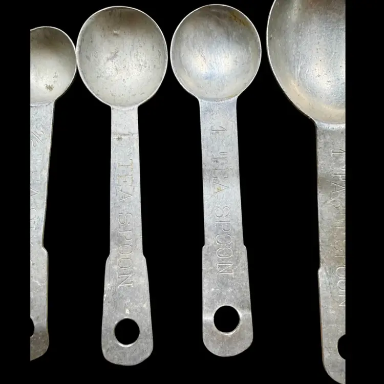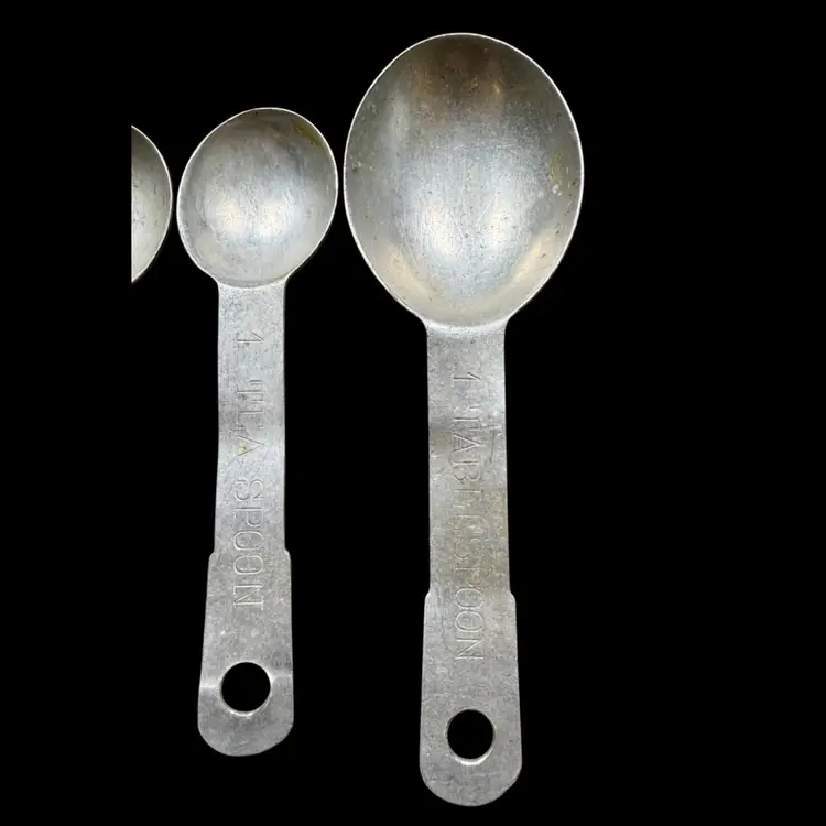 Between 4”-5”. A lot of SEVEN (7) aluminum antique measuring spoons. Includes: TWO - 1/4 tsp, TWO - 1/2 tsp, TWO - 1 tsp, ONE - 1 tbsp. Each spoon has a hole at the end of the handle to be able to attach to a ring (no ring included). *NOTE the largest spoon (tbsp) has a few slight bends in it’s handle, see picture.
