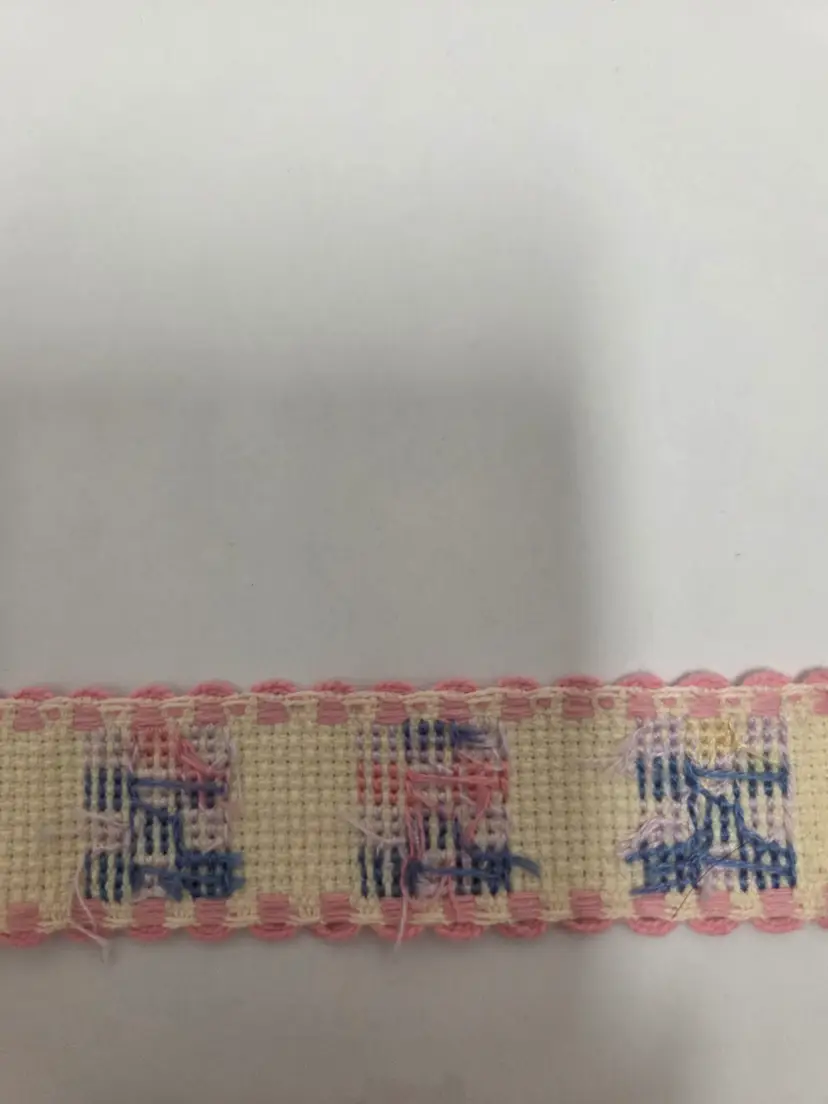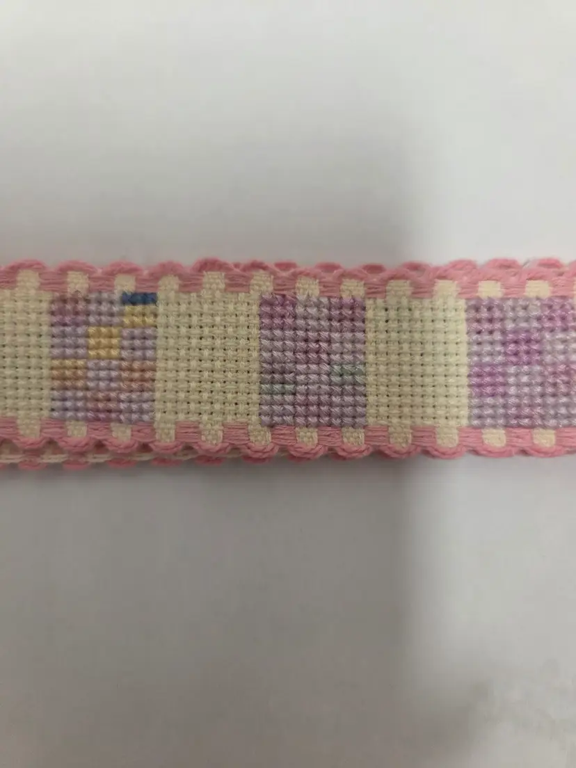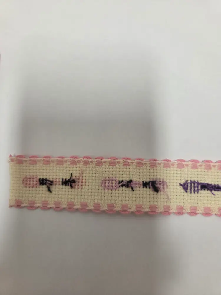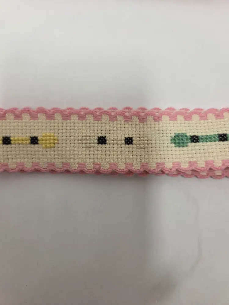 Craft and sewing themed cross-stitched Ribband to add to your projects. Ribband was stitched by seller. Ribband is 1" wide and the following lengths; buttons 28", stripes 35", embroidery floss 36" and quilts 21".