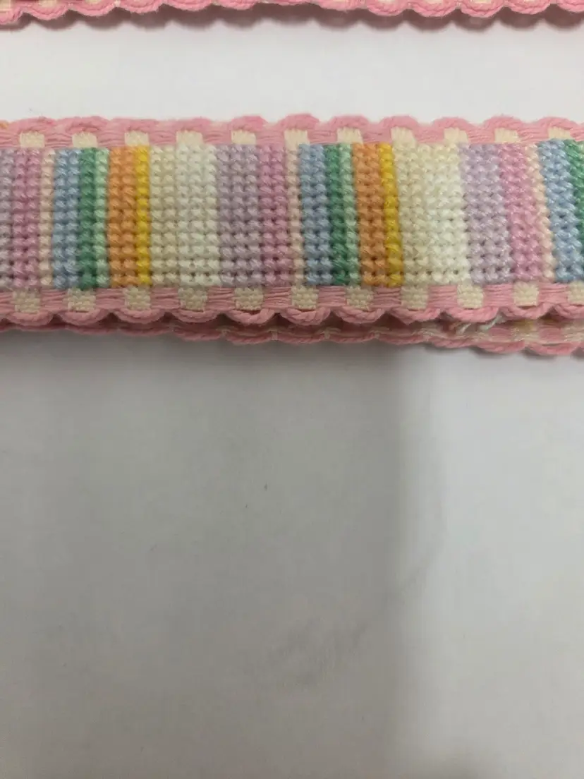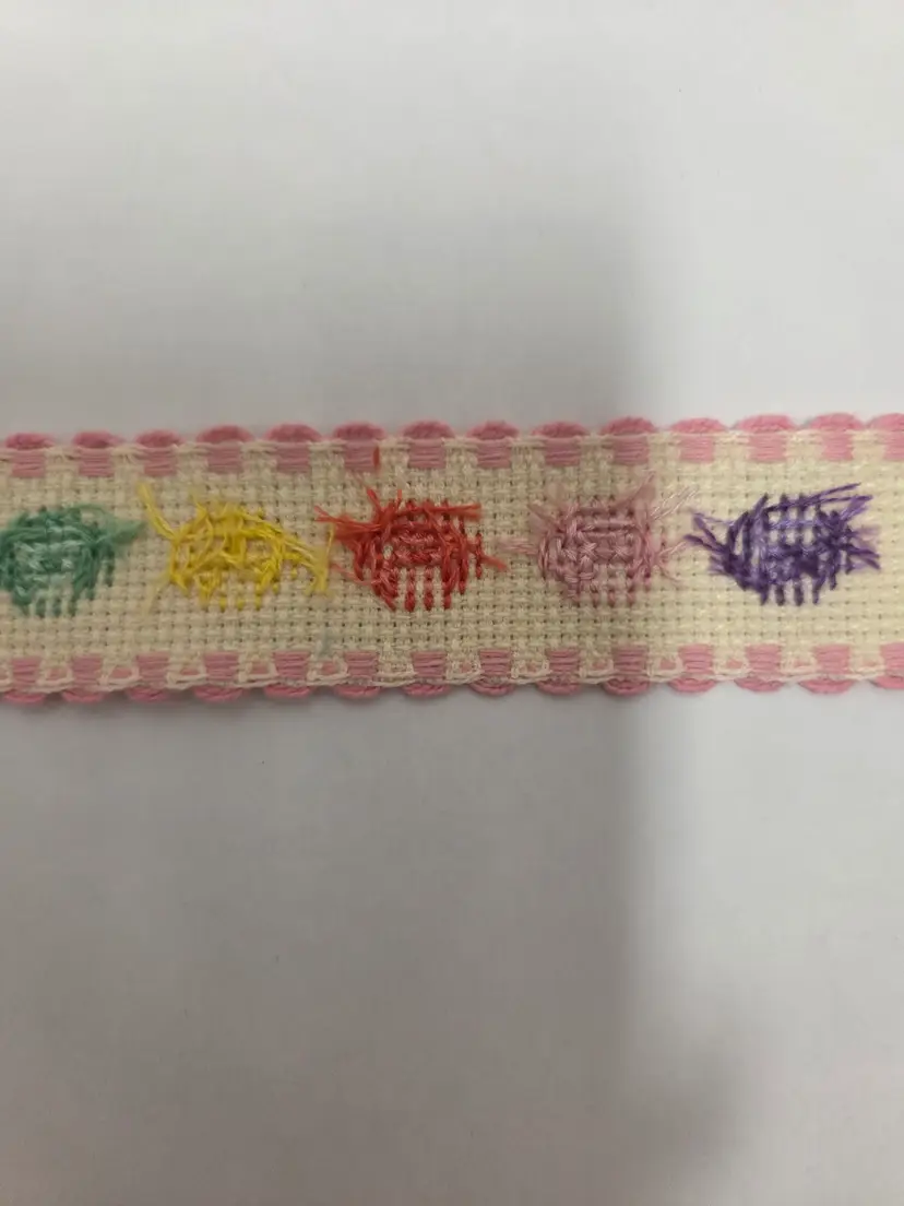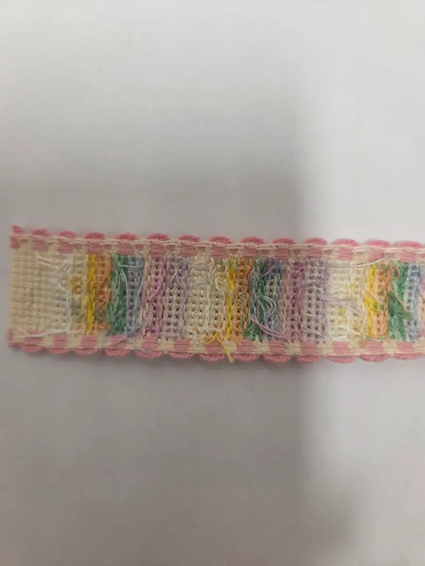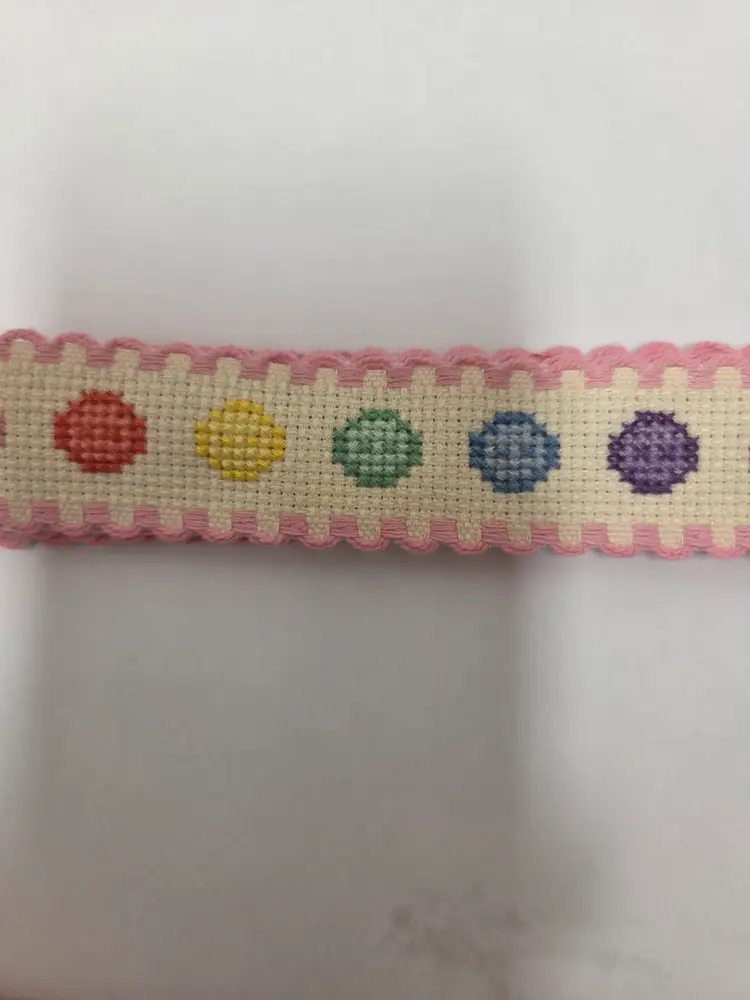 Craft and sewing themed cross-stitched Ribband to add to your projects. Ribband was stitched by seller. Ribband is 1" wide and the following lengths; buttons 28", stripes 35", embroidery floss 36" and quilts 21".