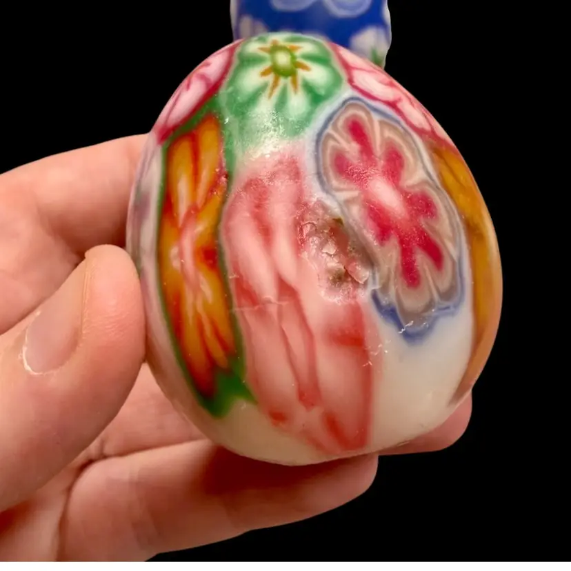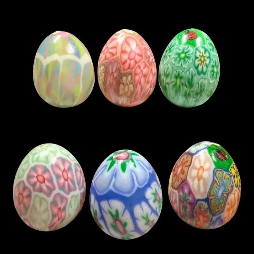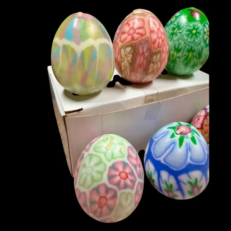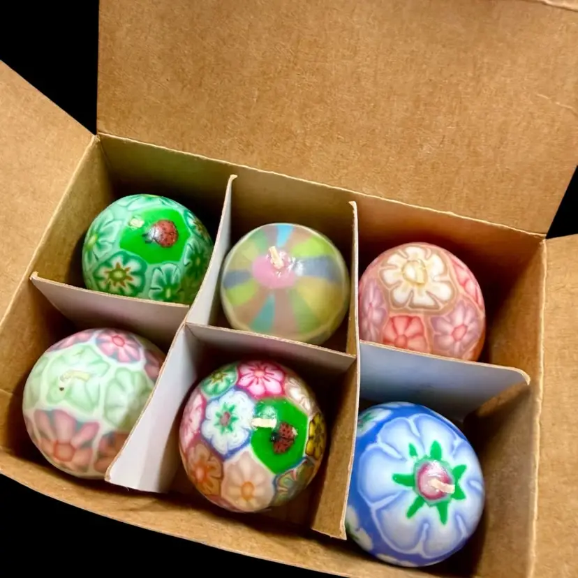 Lot of SIX egg-shaped candles. Each are made with a different intricate, millefiori style design, all different colors. Two eggs feature a cute little ladybug as well! None have been burned, all have wicks. Comes with storage box. *NOTE the most colorful egg has a little dent in the side, see picture.