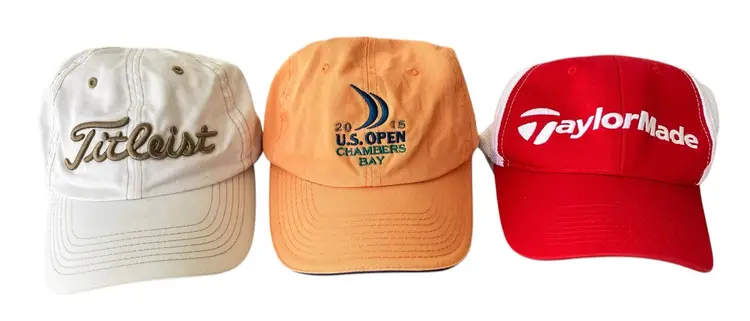 This lot includes three golf-themed hats from top brands such as Titleist, TaylorMade, and USGA US Open 2015. These hats are perfect for any golf enthusiast looking to add to their collection. The hats come in a variety of colors and styles, making them suitable for any occasion, even casual wear.