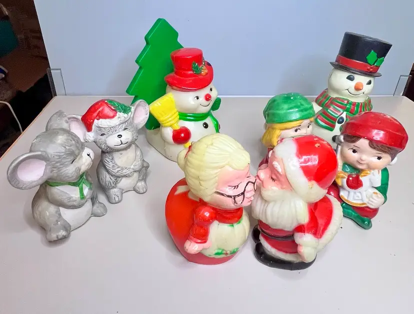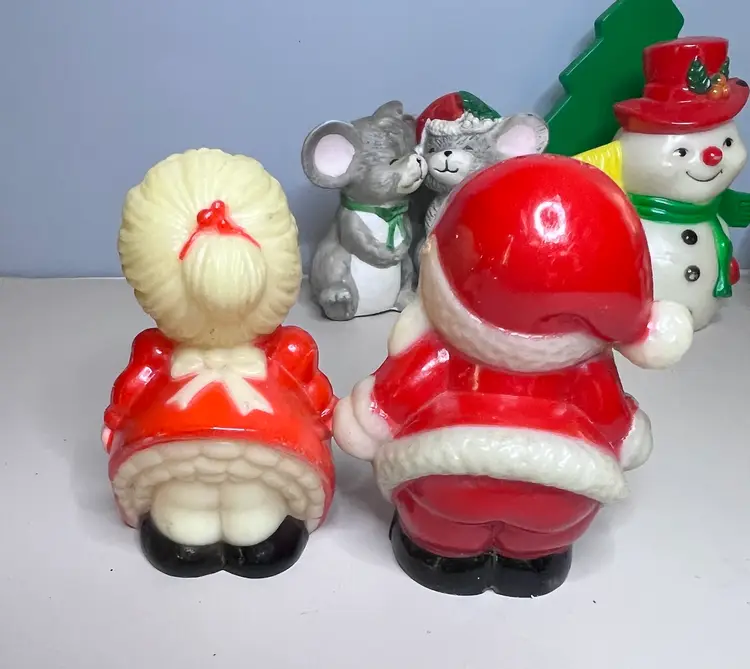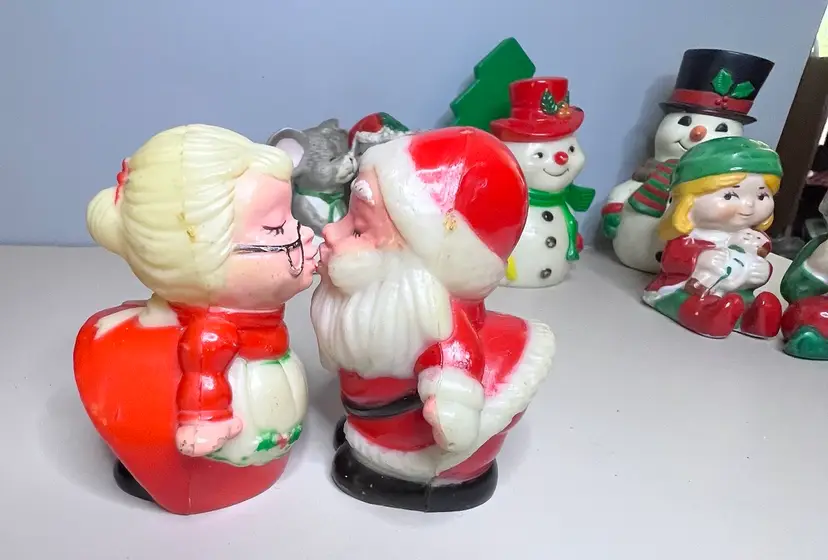 Santa and Mrs Claus bottoms up kissing salt and pepper shakers. Plastic. 2 3/4”
