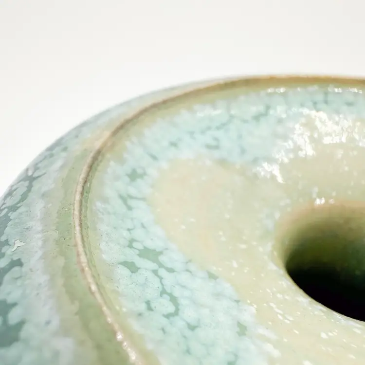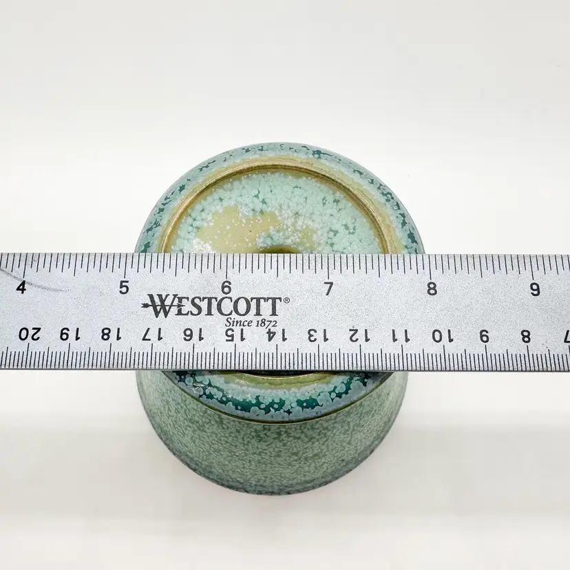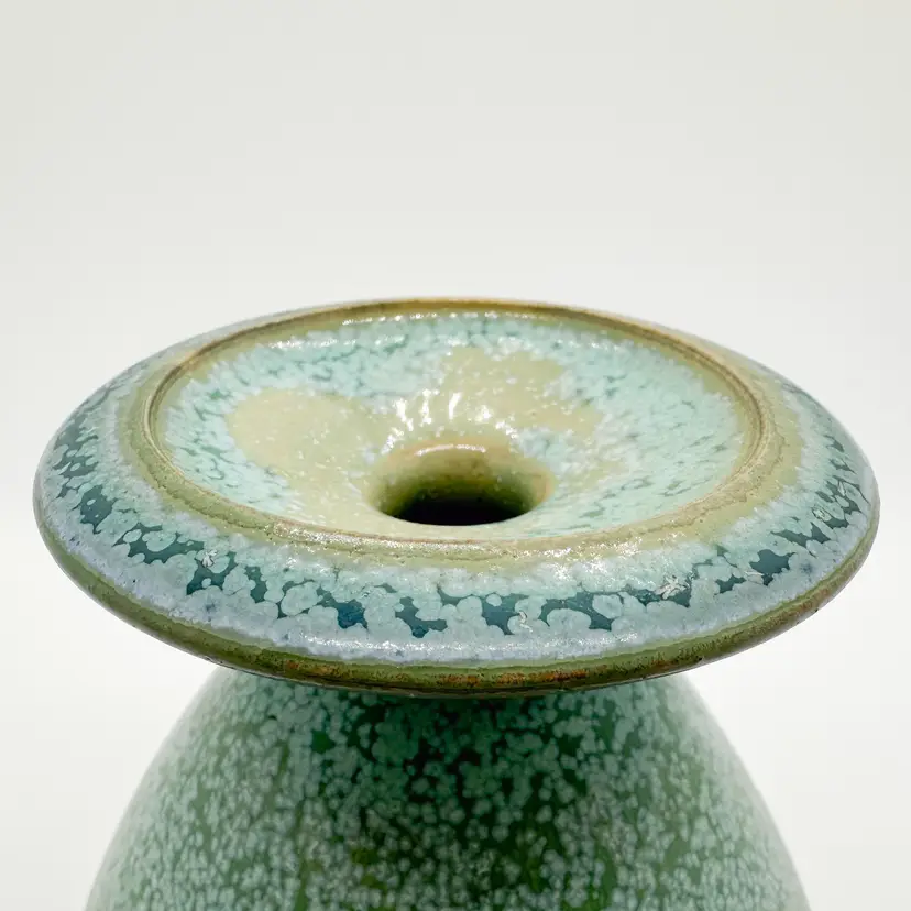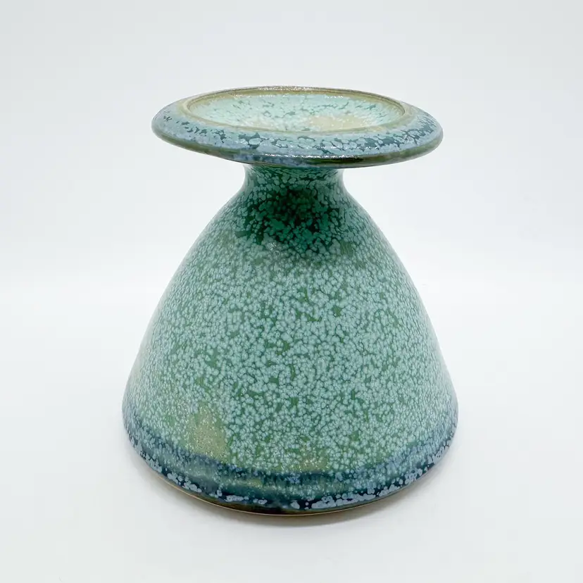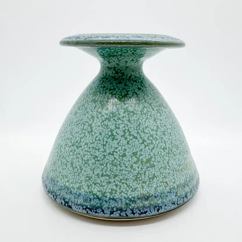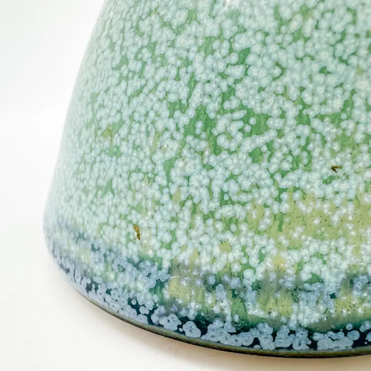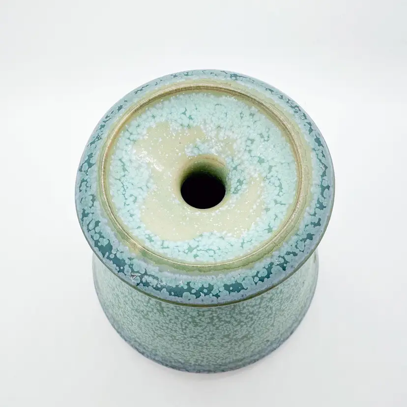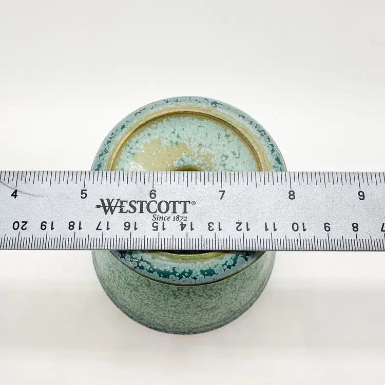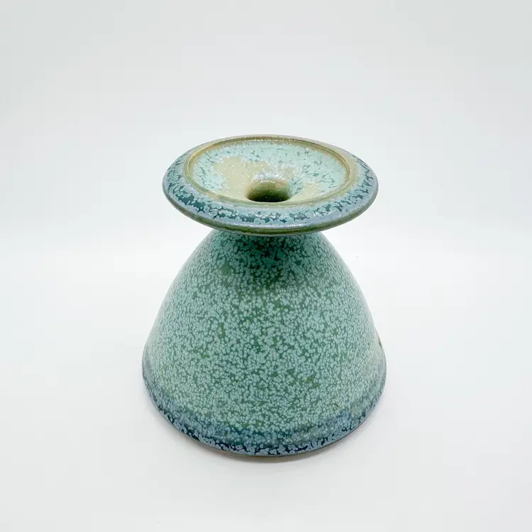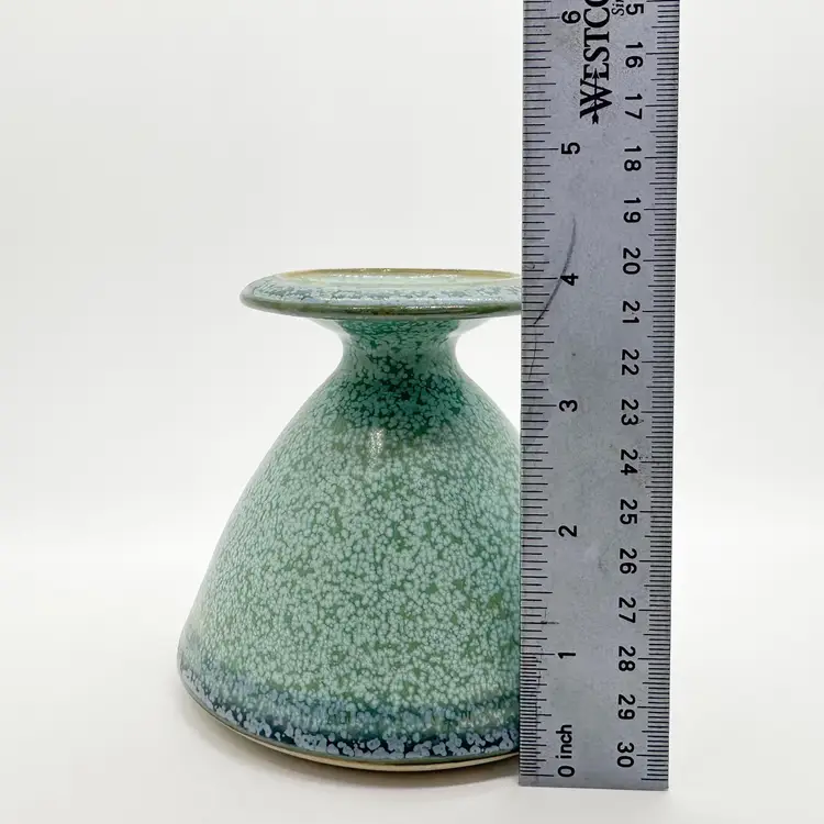 Louis Mulcahy, Dingle Ireland, Pottery Oil Lamp Bud Vase Vintage Green Blue 2000 Approximately 4" H X 4" D Does not include wick, wick holder, or oil Would make a beautiful bud vase Beautiful green, blue, tan coloring Signed Original sticker attached, loose on one side Pre-loved, excellent condition, see all photos See all photos for complete description and/or dimensions