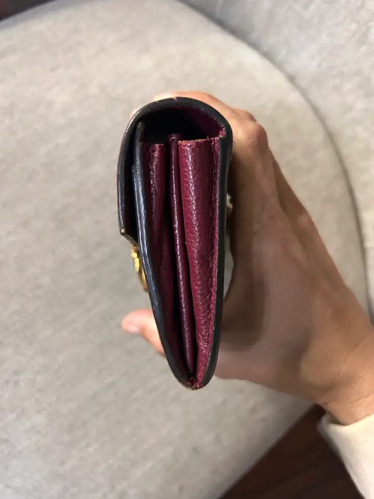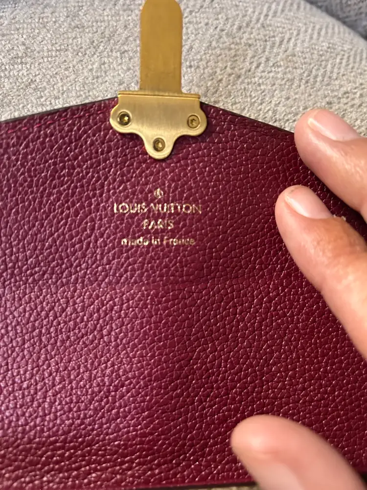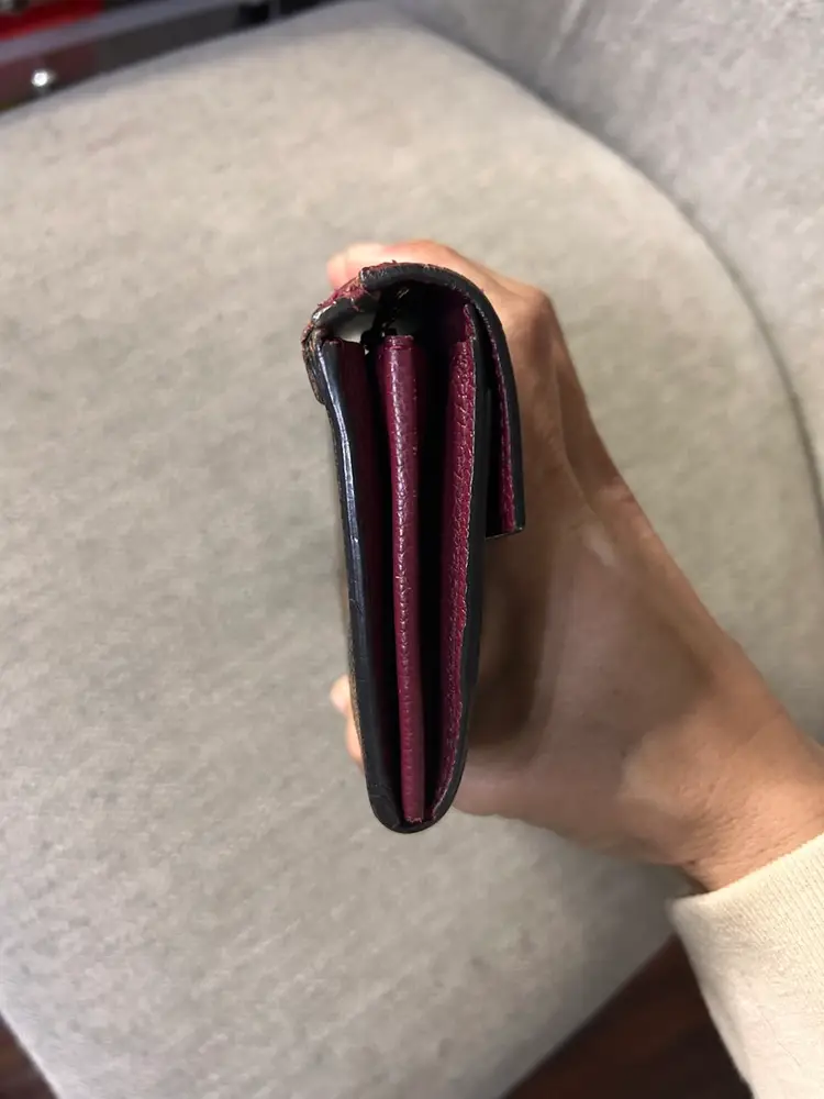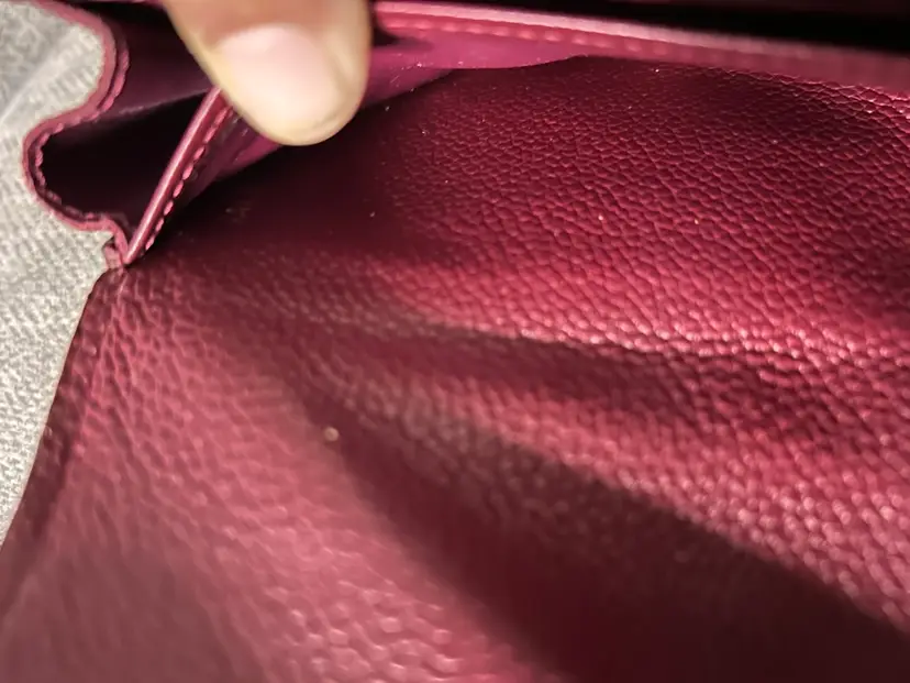 This wallet is actually very beautiful. There are callouts shown in pictures, the corner on one side and initials on the inside minor scratches/ware to the hardware