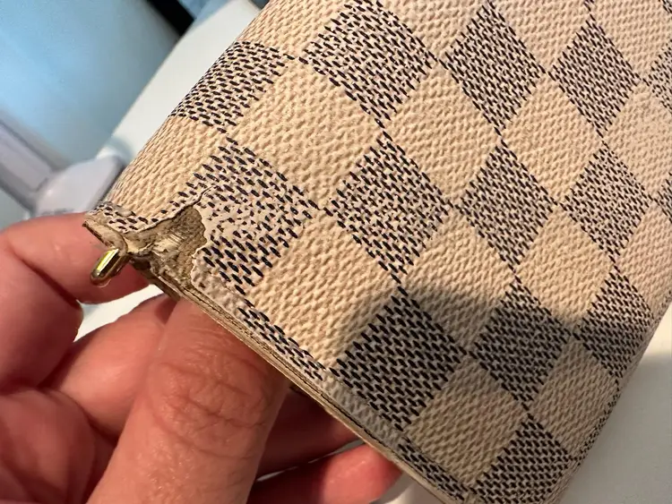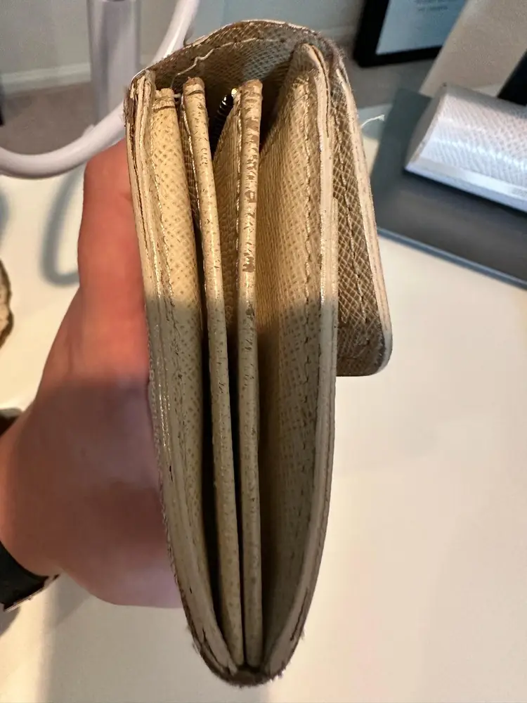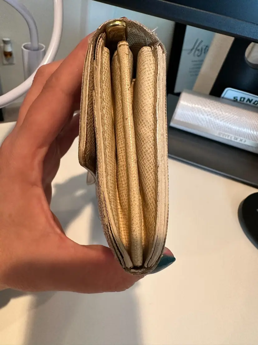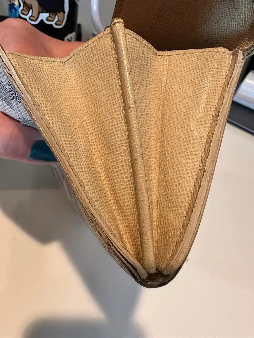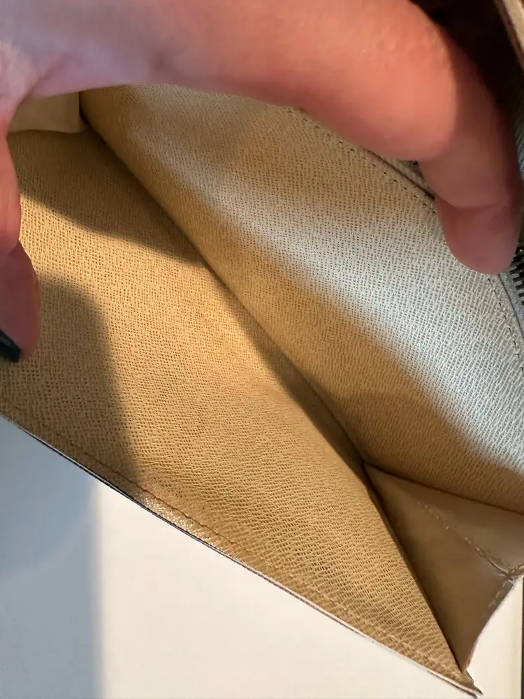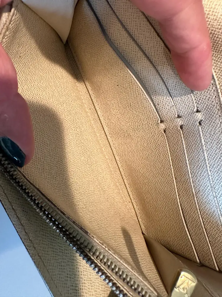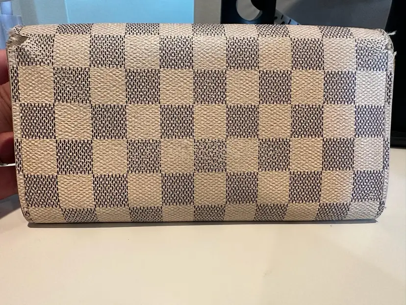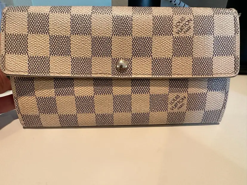 LV Damier Azure Sarah Wallet Condition: Preloved with visible signs of wear. Interior has rubs/scratches, stains. Has initials on the interior flap. Exterior has rips at the corners, rubs, stains. Date code: CA4068
