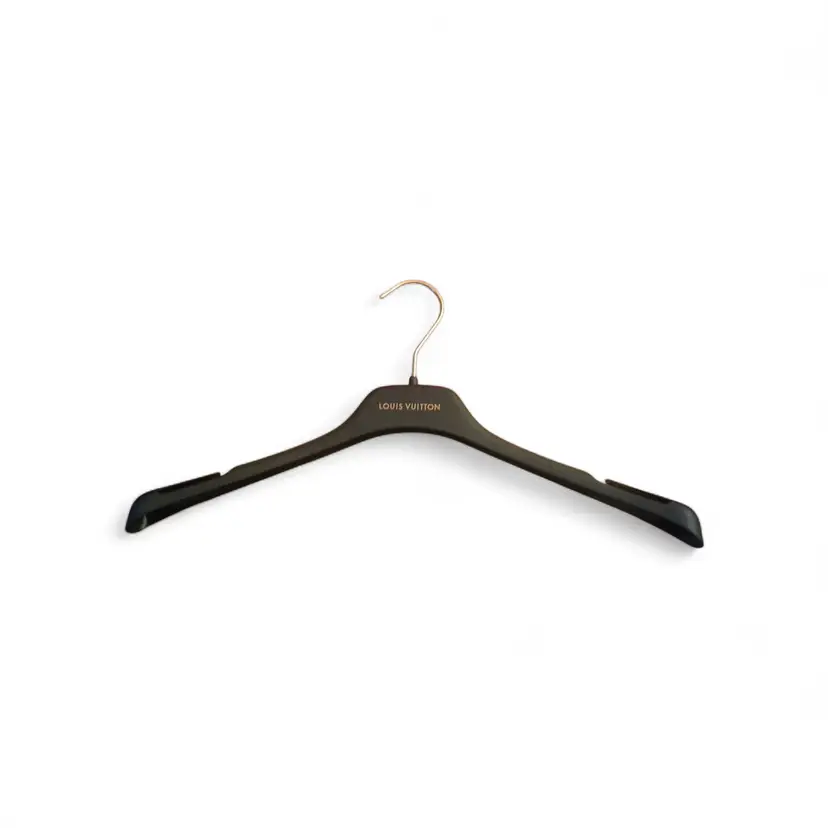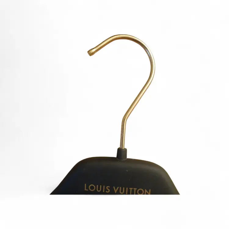 Elevate you closet with this Louis Vuitton matte black garment hanger! It features a gold-toned hook and the brand name embossed on the hanger. Callouts: a few small scratches on the right side of the hanger (see pic for details) but otherwise in great condition. Dimensions L - 8 in x W - 15 in x D - 1 in (Length from end of hanger to top of hook, depth from widest portion of hanger at the end) Length of hook - 3.5 in