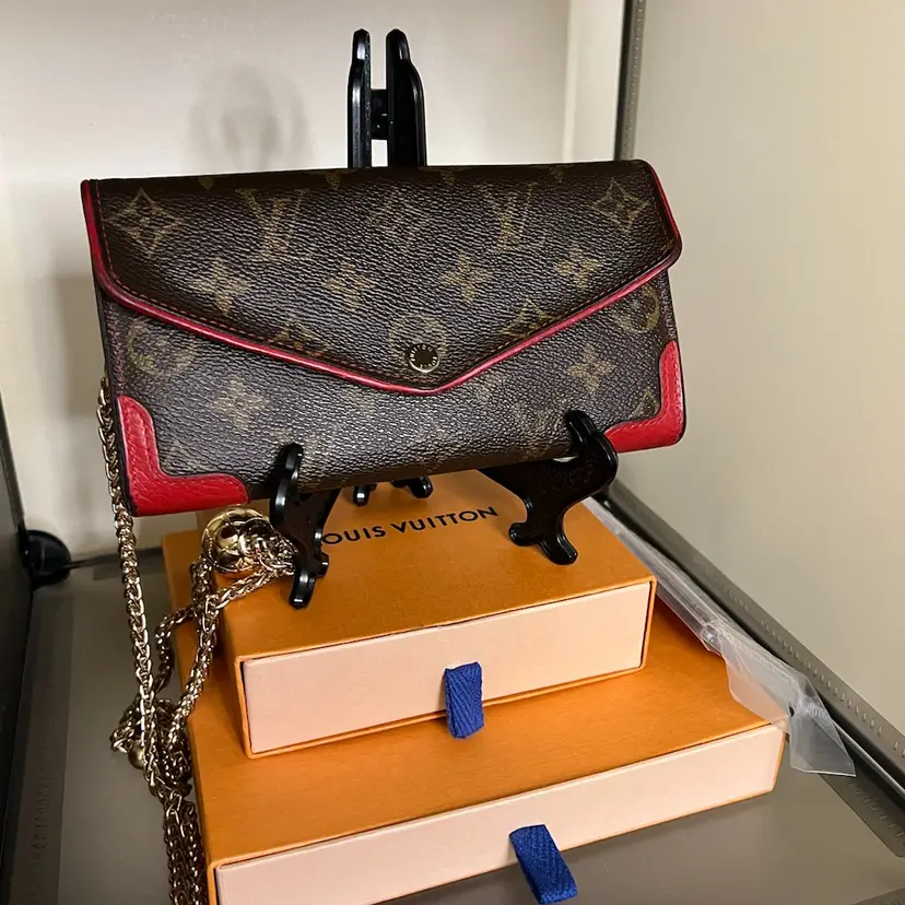 Absolutely amazing monogram canvas with red leather! Stunning. A little wrinkles in coin compartment.