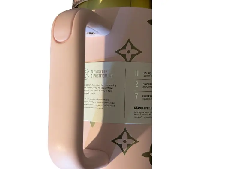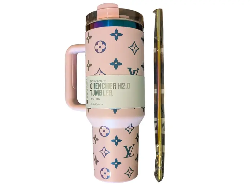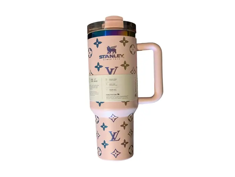 The Louis Vuitton Stanley Cup Tumbler 40oz Limited Edition in pink is a stylish and functional two-piece tumbler set made of stainless steel. With a drink-through lid and insulated design, this tumbler can keep beverages hot for 12 hours and cold for 6 hours. The elegant Louis Vuitton pattern and light pink color add a touch of luxury to your drinkware collection. Perfect for adults, this tumbler is ideal for both hot and cold beverages, making it a versatile addition to your kitchen storage and organization setup. Made in the United States, this tumbler is a unique and high-quality piece for any Louis Vuitton enthusiast.