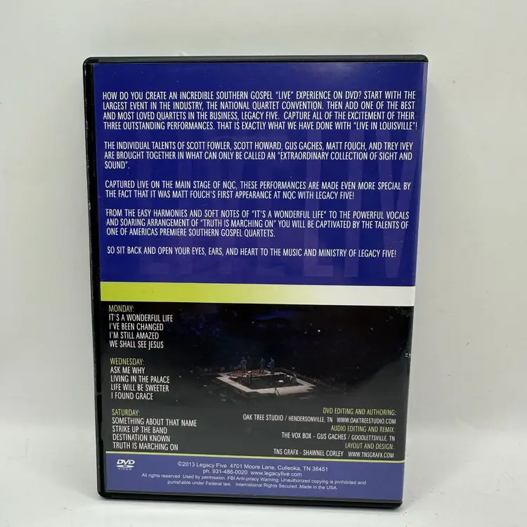 The "Louisville Live" DVD captures the dynamic performance of Legacy Five from the main stage of the National Quartet Convention. This DVD includes powerful gospel music and memorable performances, offering a delightful experience for gospel music enthusiasts.