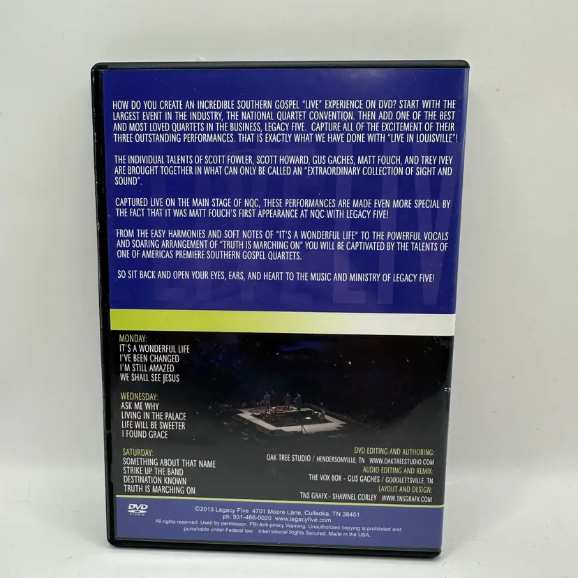 • DVD format • Features live gospel music • Performance by Legacy Five • From the National Quartet Convention • Includes multiple tracks