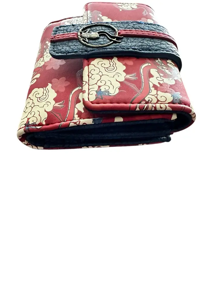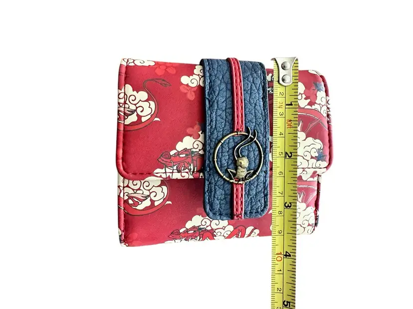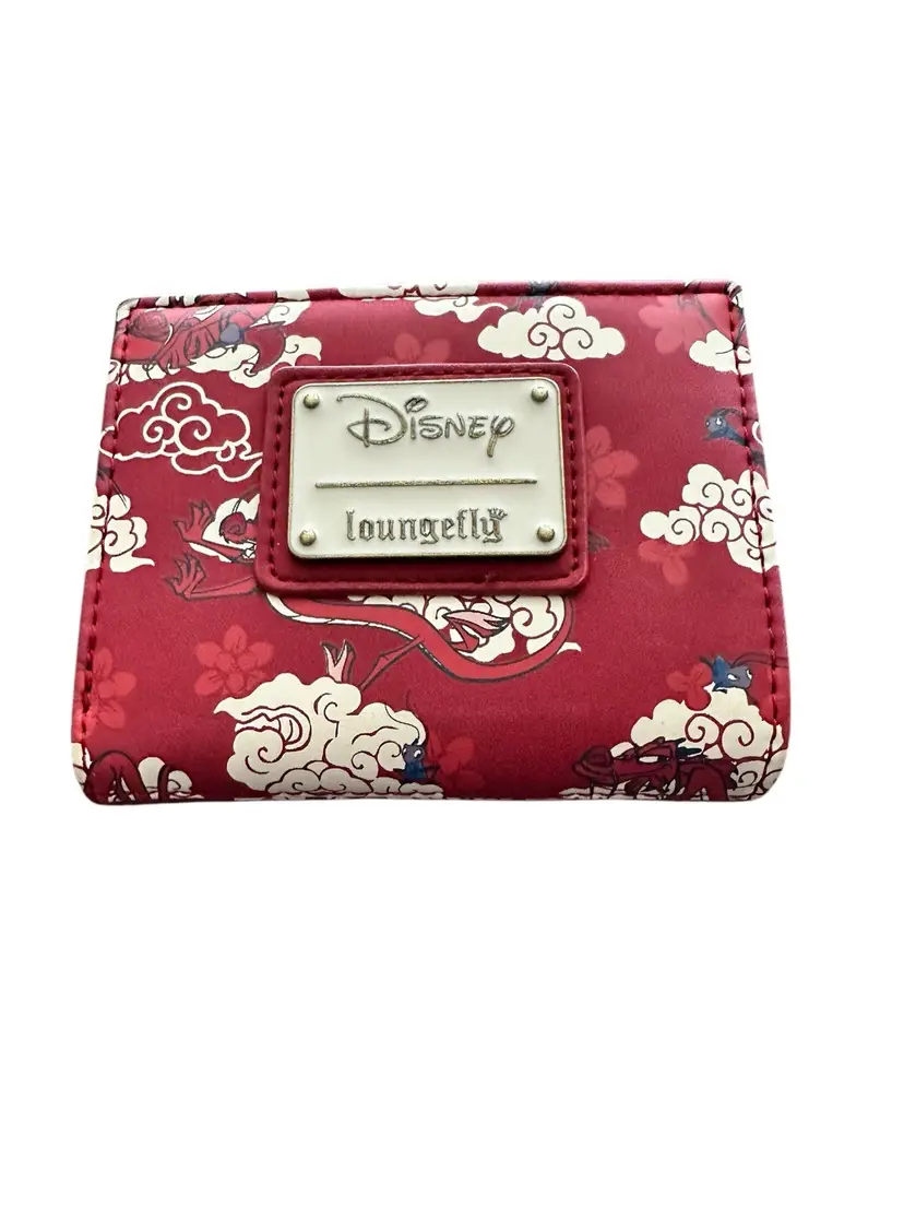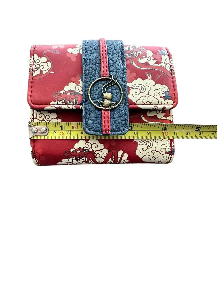 This Loungefly wallet is a must-have for any Disney fan! The wallet features the iconic characters Mulan, Mushu, and Cri-Kee, along with beautiful red and blue clouds. The wallet is small in size, making it perfect for on-the-go. It is made of high-quality materials, ensuring its durability. The wallet is preowned, but its condition is still excellent.