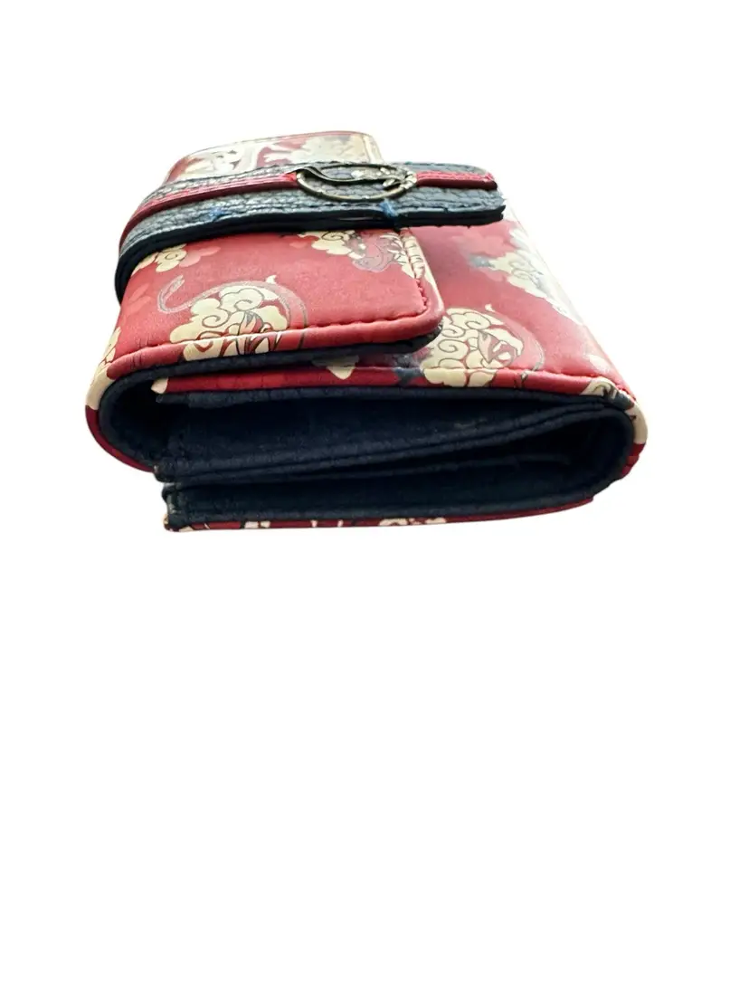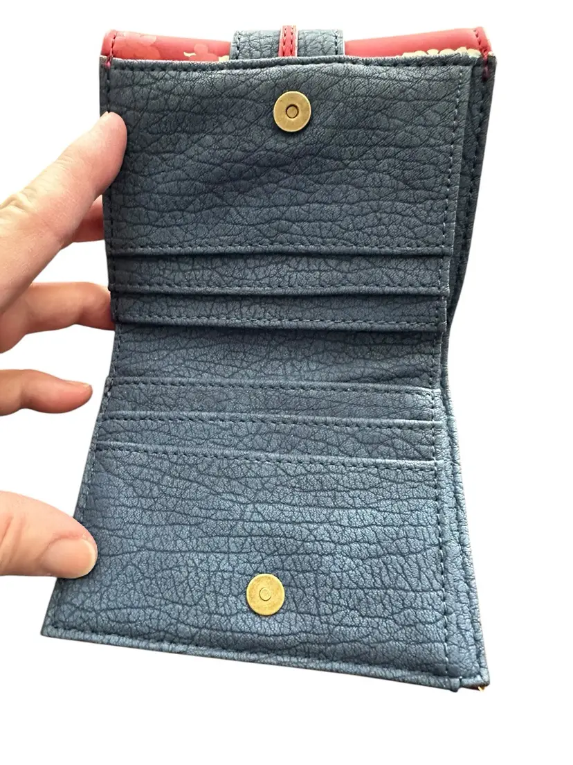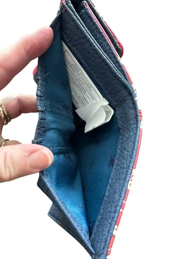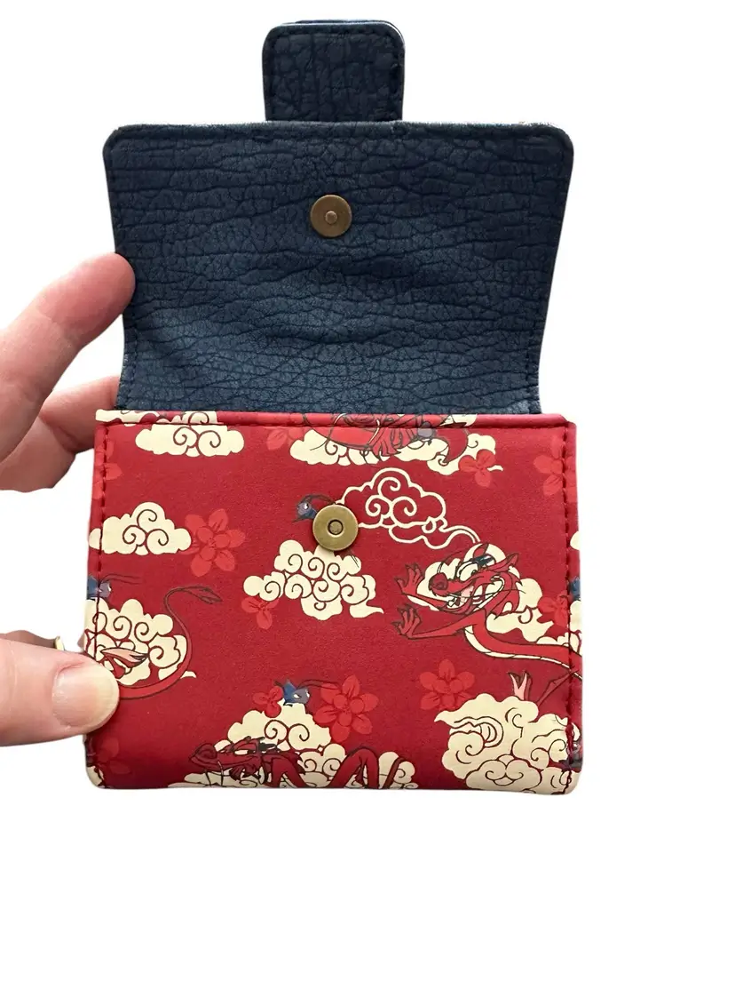 This Loungefly wallet is a must-have for any Disney fan! The wallet features the iconic characters Mulan, Mushu, and Cri-Kee, along with beautiful red and blue clouds. The wallet is small in size, making it perfect for on-the-go. It is made of high-quality materials, ensuring its durability. The wallet is preowned, but its condition is still excellent.