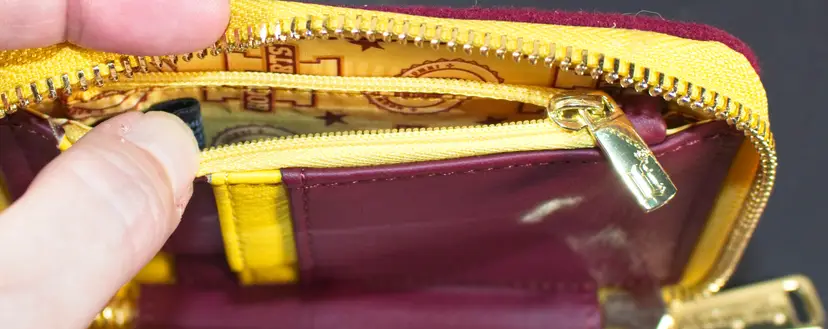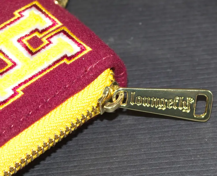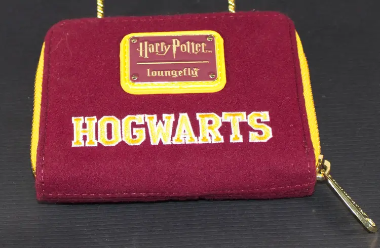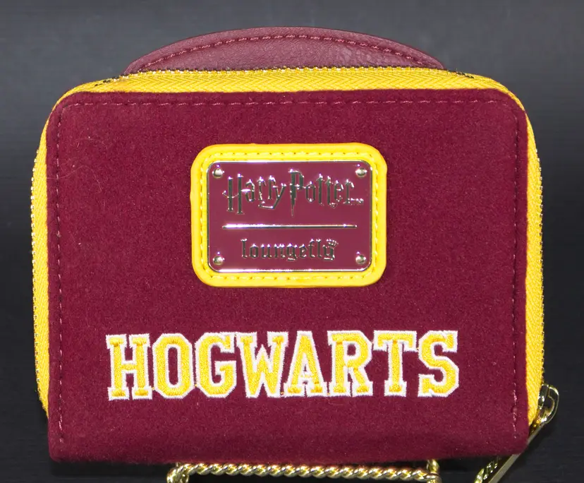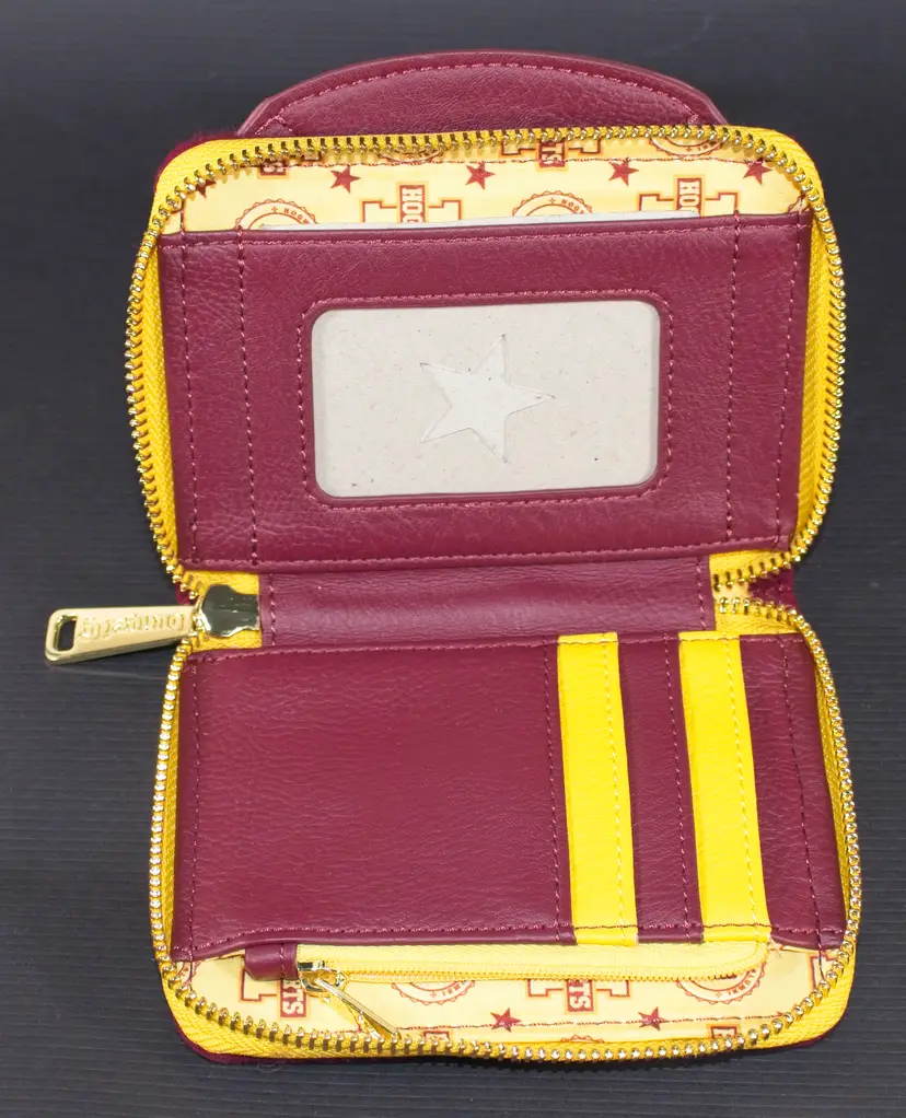 Loungefly Harry Potter Hogwarts Crest Varsity Jacket Wallet Zip Around. In good condition. Has driver license window with pocket behind it. 4 credit card slots with zippered coin compartment. No outside pockets. Felt on the outside. Vinyl on the inside. 5" wide x 4" tall x 1" thick