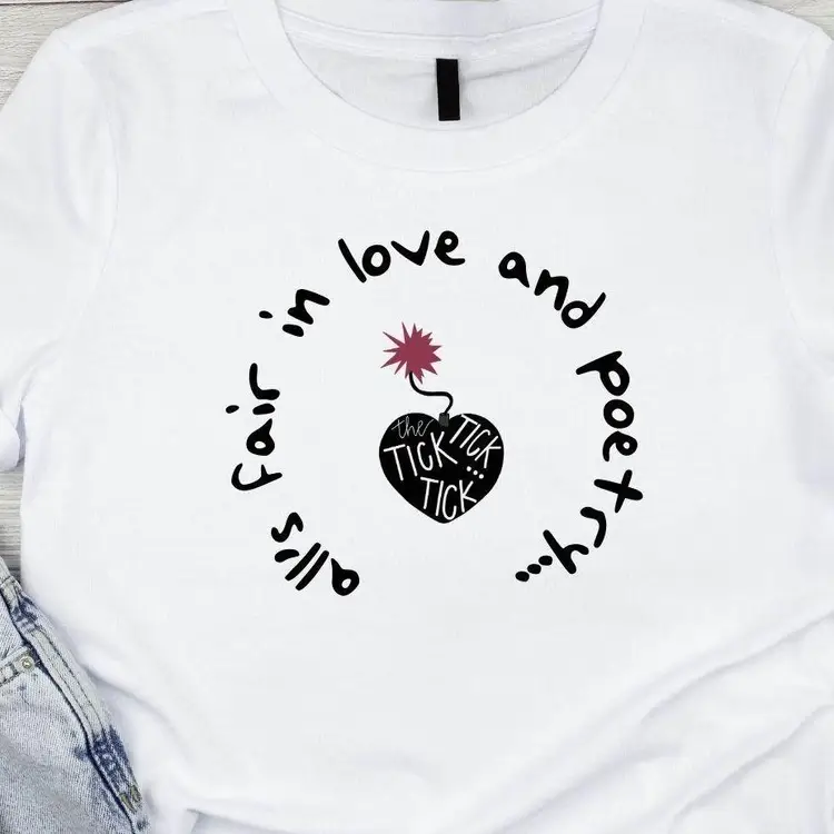 TTPD inspired tee. Design features a heart shaped bomb with the "All's Fair in Love and Poetry" quote.