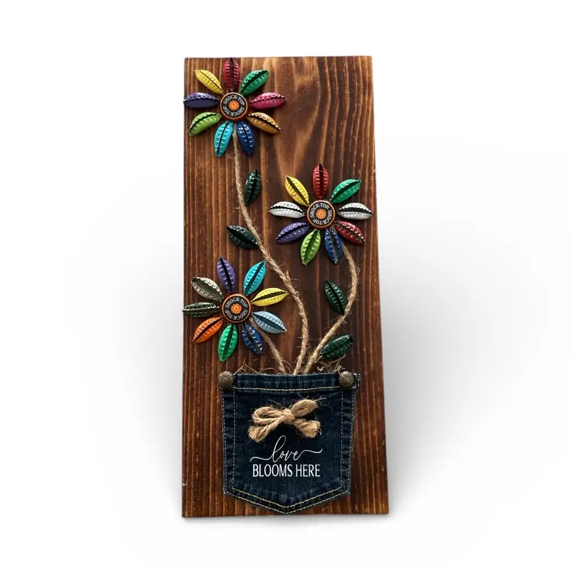 Brighten up your space with this charming wall art featuring colorful flower bottle caps with a denim pocket with 'Love Blooms Here' text. Perfect for adding a rustic touch to any room. Size: 7.25 x 17”