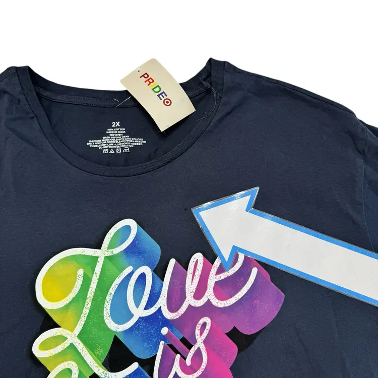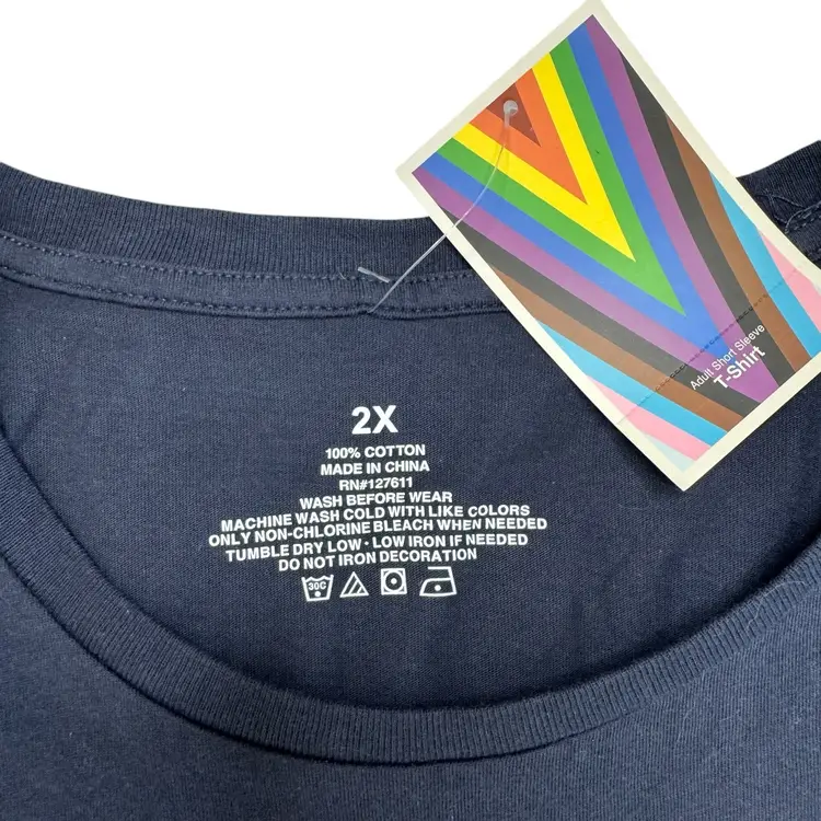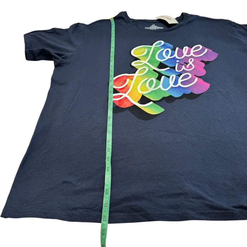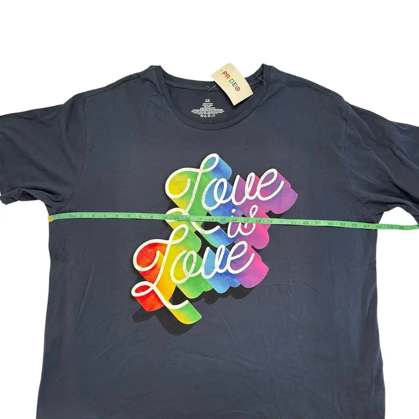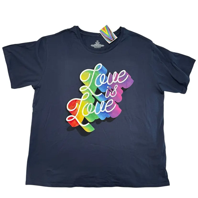 “Love is Love” New-with-tags Pride Navy Blue with Rainbow Lettering Short Sleeve Tee. Size 2X Unisex Adult. 100% cotton. Retail: $24. Small dark spot on front from storage.